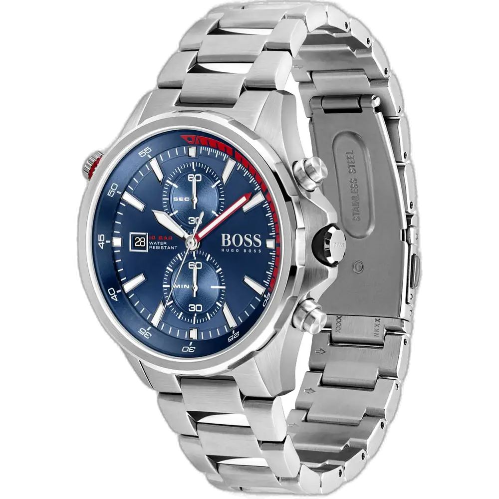 ساعة هوجو بوس جلوبتروتر 1513823 رجالية كرونوغراف، بمينا أزرق إشعاع شمسي وسوار ستانلس ستيل فضي.