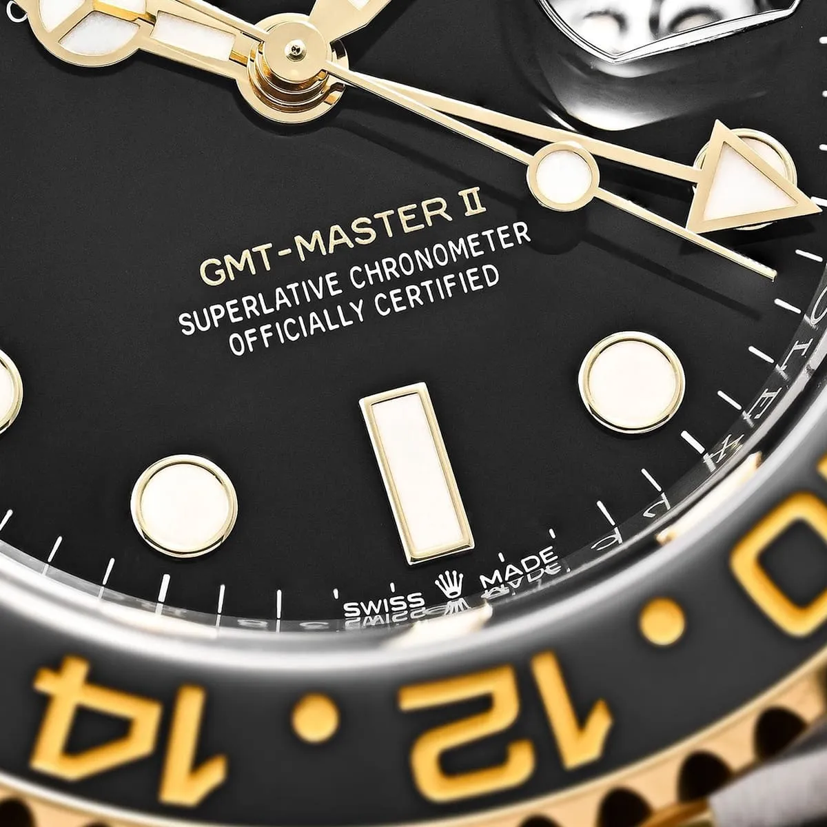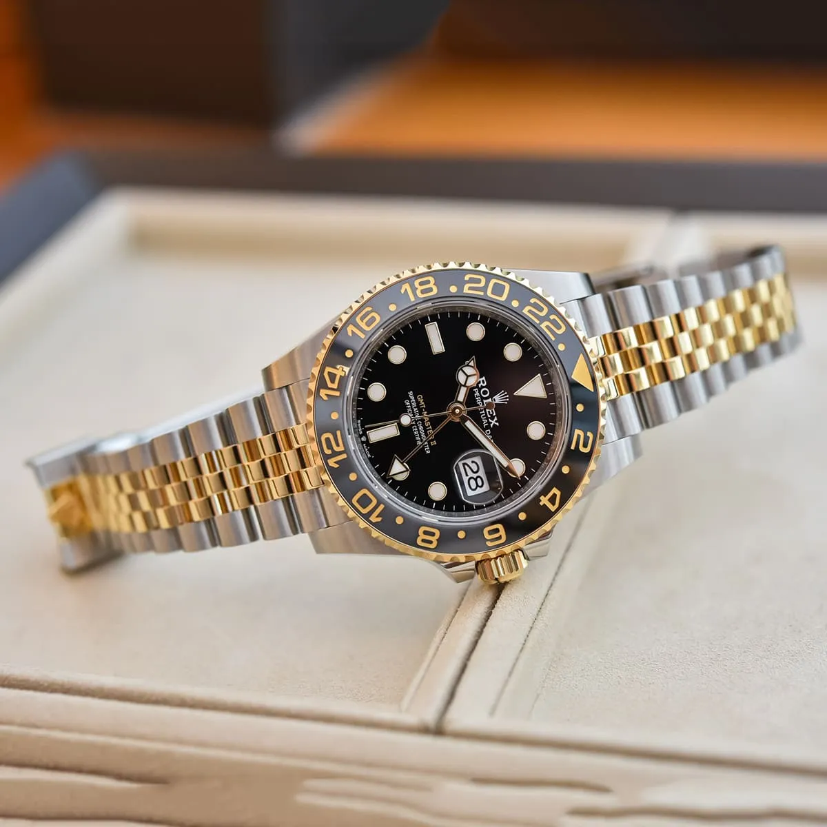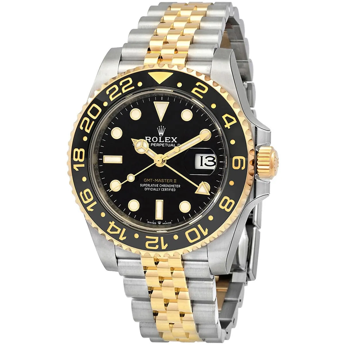ساعة رولكس GMT-Master II 126713GRNR تجمع بين الفخامة والدقة، بتصميم ثنائي اللون من الذهب الأصفر والفولاذ، مع حلقة سيراميك باللونين الأسود والرمادي، ومناسبة لعشاق السفر بفضل وظيفة عرض توقيتين مختلفين في آن واحد.