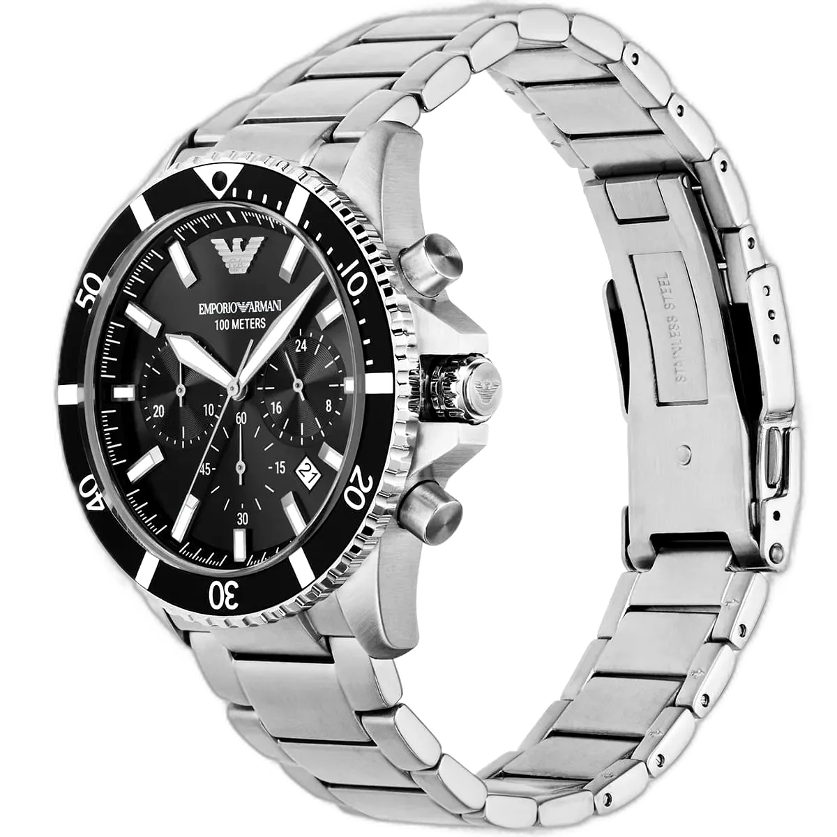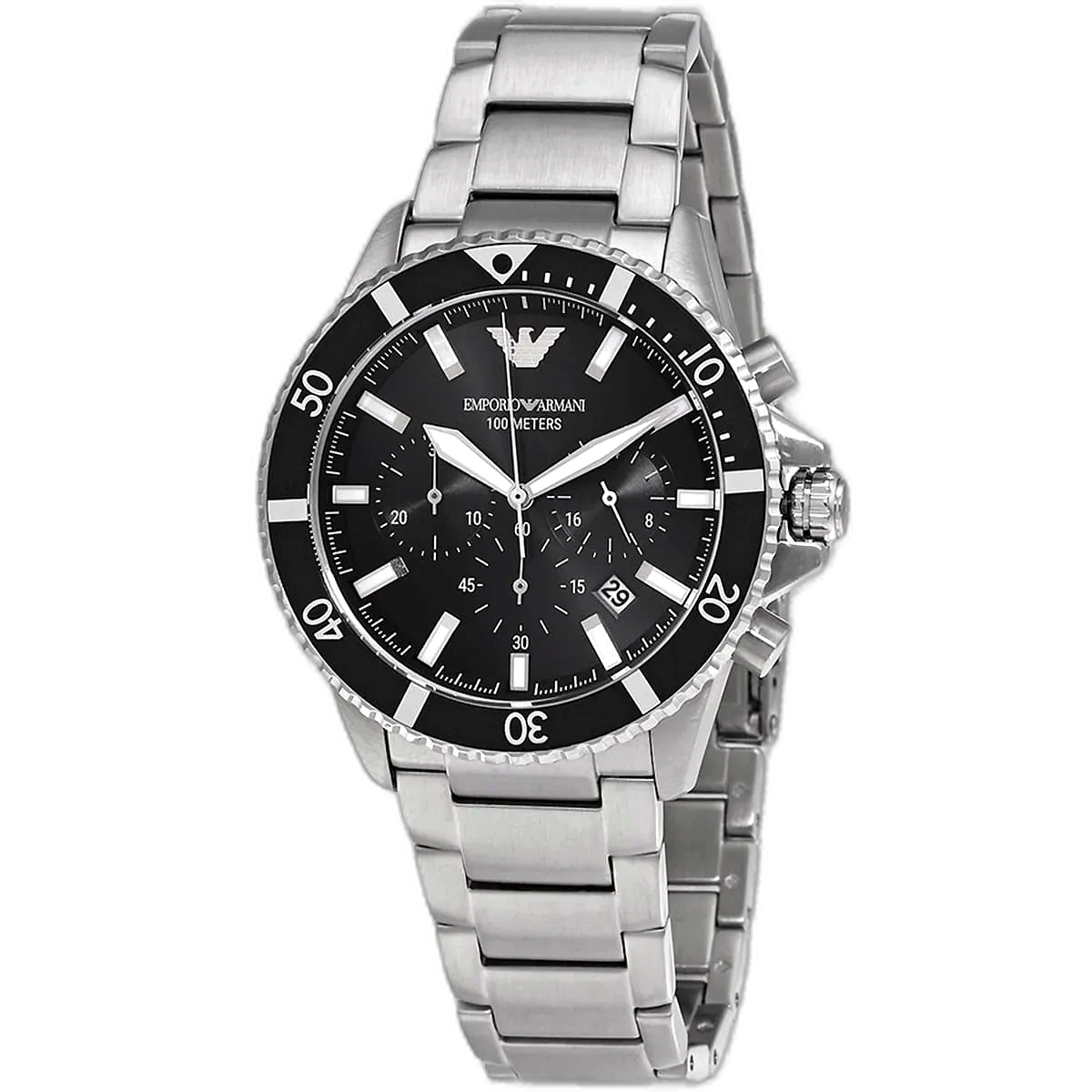 اعتمد إطلالة أنيقة ورياضية مع ساعة امبوريو ارماني Emporio Armani كرونوغراف رجالية أصلية، موديل (دايفر) Diver AR11360. تتميز هذه الساعة الأصيلة بميناء أسود جريء وسوار كلاسيكي من الستانلس ستيل بلون فضي، مما يخلق إكسسوارًا قويًا وراقيًا للرجل العصري.