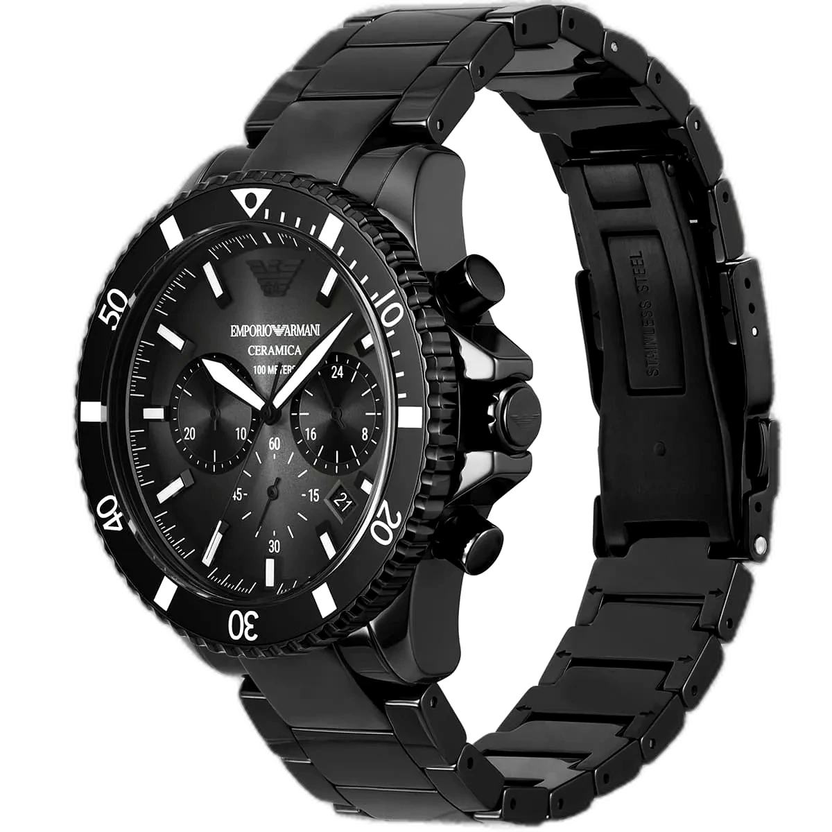 اعتمد إطلالة أنيقة وعصرية مع ساعة امبوريو ارماني Emporio Armani كرونوغراف رجالية أصلية، موديل (دايفر) Diver AR70010. تتميز هذه الساعة الأصيلة بتصميم أنيق باللون الأسود بالكامل، يجمع بين ميناء قوي وسوار من السيراميك الأسود المتين، لإطلالة راقية ومرنة.