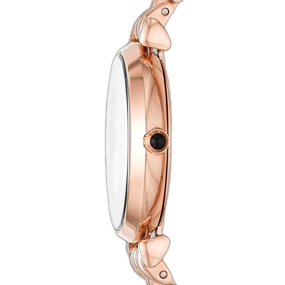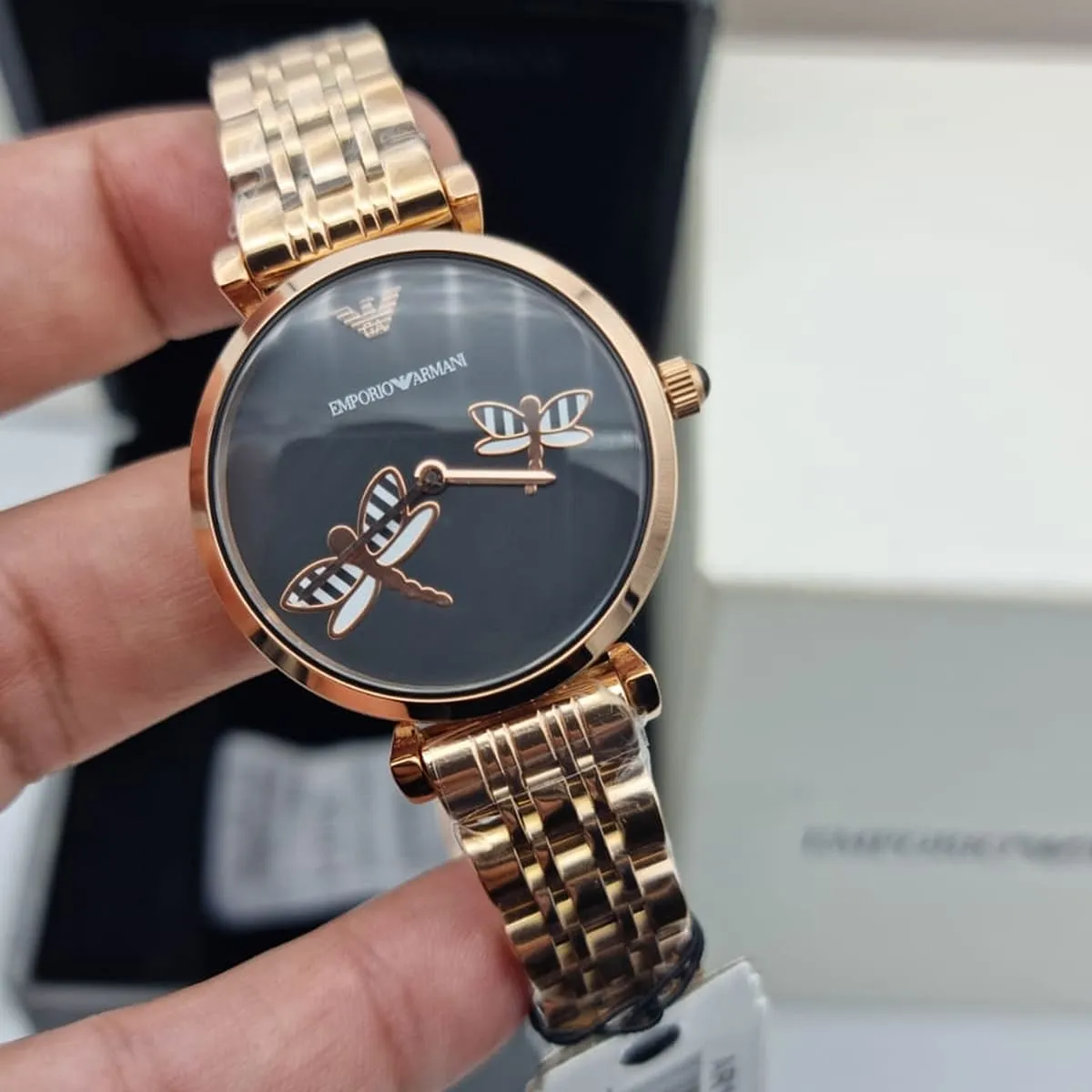 استمتعي بالأناقة الخالدة مع ساعة امبوريو ارماني جياني تي بار AR11206، المصممة للمرأة العصرية التي تقدر الجمال الراقي. تشتهر علامة امبوريو ارماني بحرفتها الإيطالية اللا مثيل لها وجودتها العالية. هذه الساعة، من مجموعة جياني تي بار، تتميز بمينا أسود مميز موضوع في هيكل نحيف من الستانلس ستيل المطلي باللون النحاسي، مما يمنحها جاذبية أنيقة وبسيطة. يتميز تصميم المينا بالبساطة مع علامات وقت دقيقة، مما يعزز من سحرها الأنيق. يكمل السوار الشبكي من الستانلس ستيل باللون النحاسي (الذهبي الوردي) هذا التصميم، مقدمًا ملاءمة مريحة وملمسًا عصريًا وانسيابيًا يزيد من جاذبيتها الفاخرة.