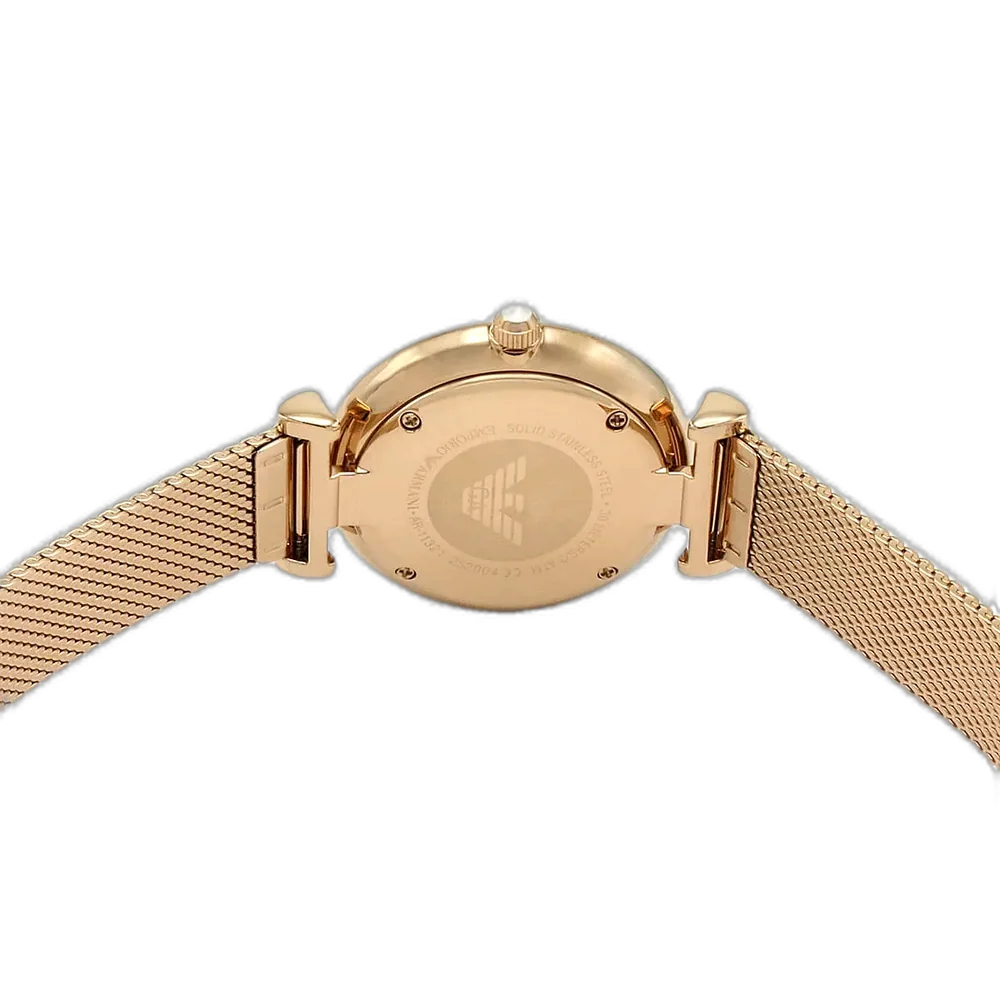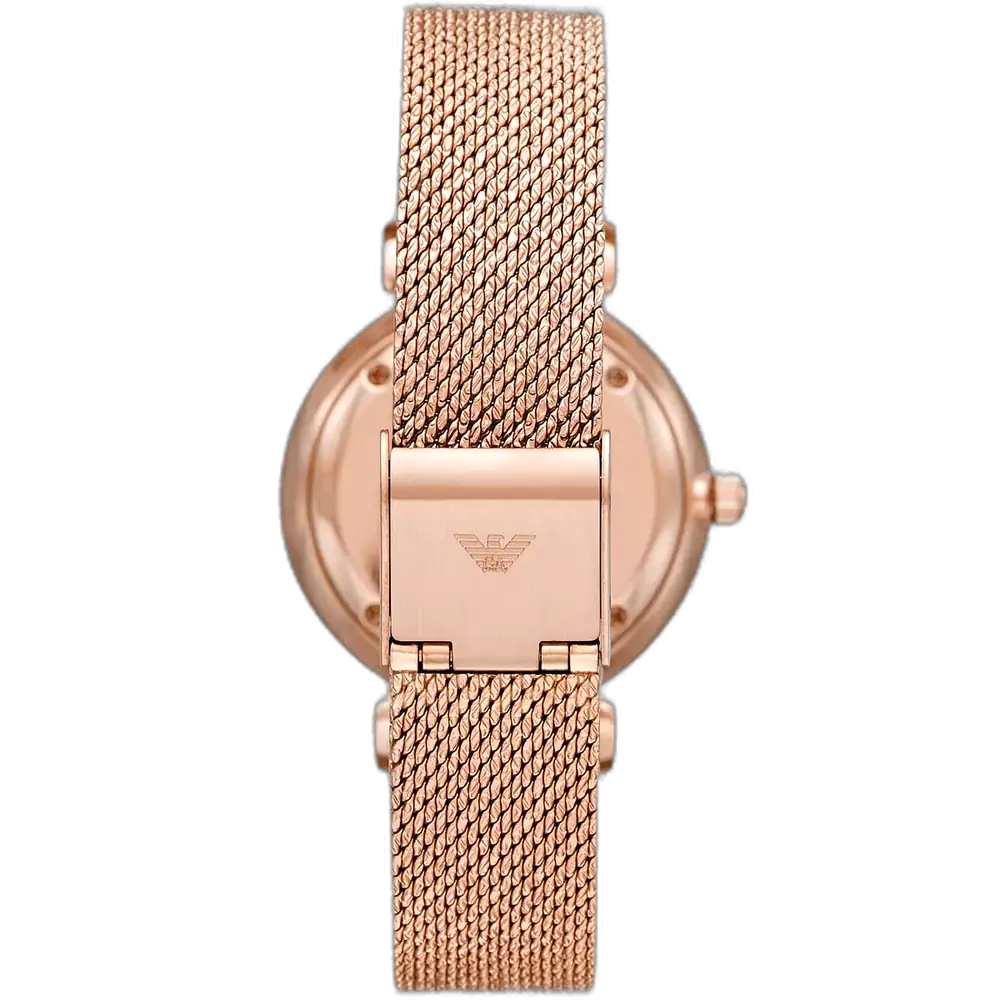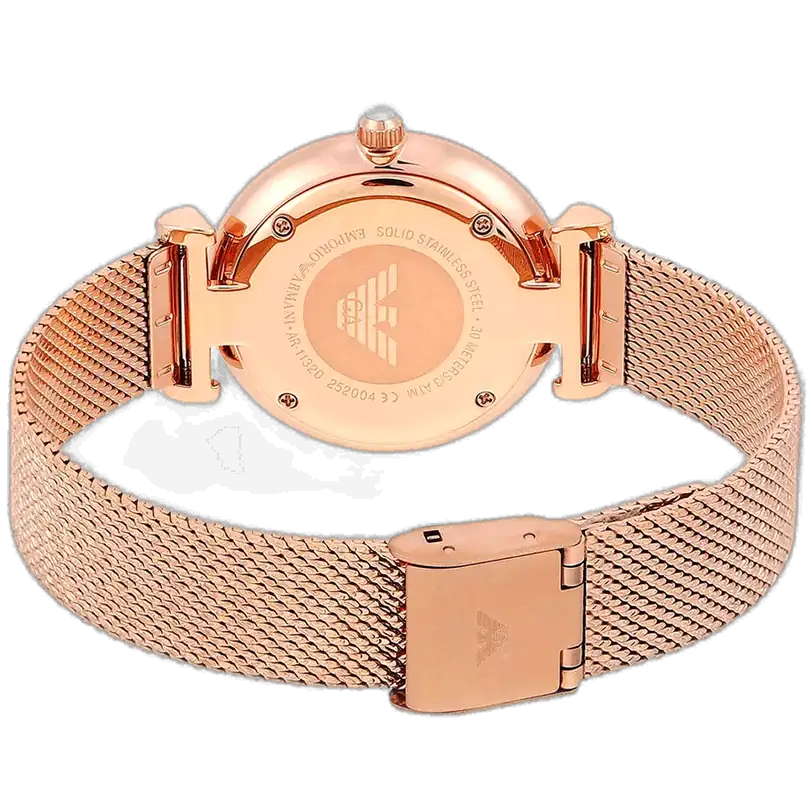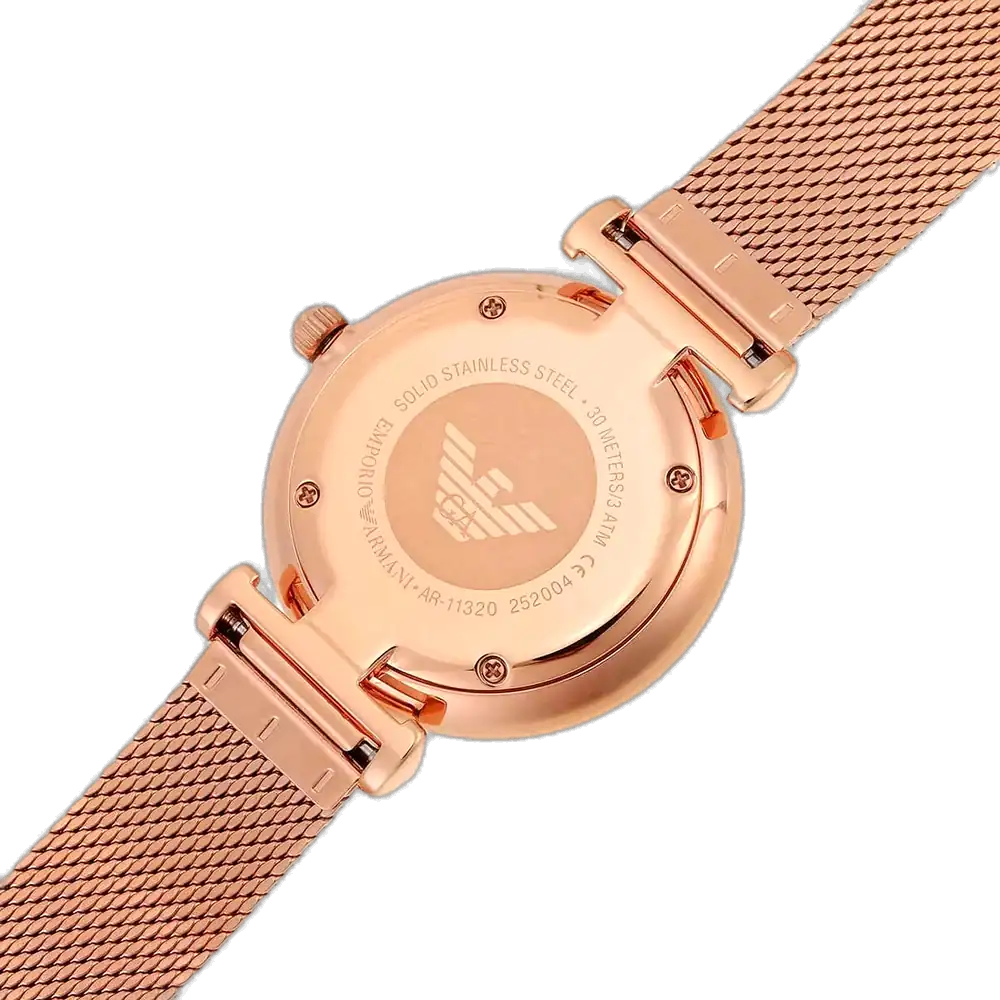 اكتشفي الأناقة الخالدة مع ساعة امبوريو ارماني الأصلية للسيدات، موديل (جياني تي بار) AR11320. تتميز هذه الساعة الراقية بمينا أبيض ناصع وسوار شبكي من الستانلس ستيل باللون النحاسي (الذهبي الوردي)، لتجمع بين الفخامة والأناقة العصرية.
