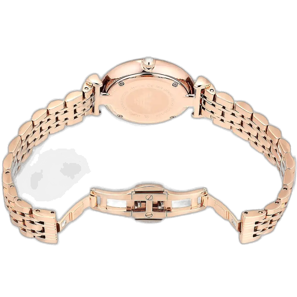 ارفعي مستوى أناقتك مع ساعة امبوريو ارماني جياني تي بار AR11446، المصممة للمرأة التي تقدر الجمال الراقي والحرفية الإيطالية. تشتهر علامة امبوريو ارماني بمزجها المثالي بين التصميم العصري والجودة العالية. هذه الساعة، من مجموعة جياني تي بار الشهيرة، تتميز بمينا فضي أنيق موضوع في هيكل مصقول من الستانلس ستيل المطلي باللون النحاسي، مما يمنحها جاذبية فاخرة وبسيطة. يتميز تصميم المينا بالبساطة مع علامات وقت دقيقة، مما يعزز سحرها الراقي. السوار الشبكي من الستانلس ستيل باللون النحاسي (الذهبي الوردي) يكمل هذا التصميم، مقدمًا ملاءمة مريحة وملمسًا عصريًا وانسيابيًا يزيد من جاذبيتها الفاخرة.