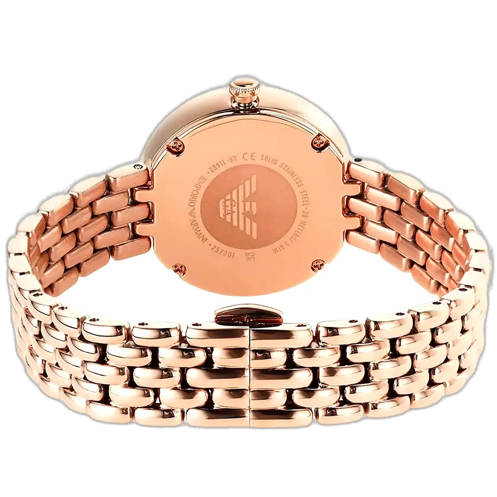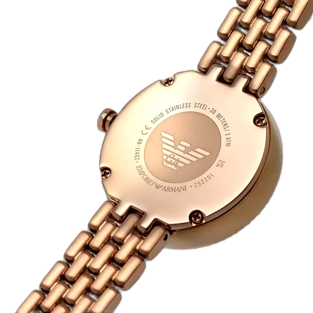 اكتشفي الأناقة الراقية مع ساعة امبوريو ارماني الأصلية للسيدات، موديل (روزا) AR11462. تتميز هذه الساعة الراقية بمينا أبيض ناصع وسوار شبكي من الستانلس ستيل باللون النحاسي (الذهبي الوردي)، لتجمع بين الفخامة الخالدة والأناقة العصرية.