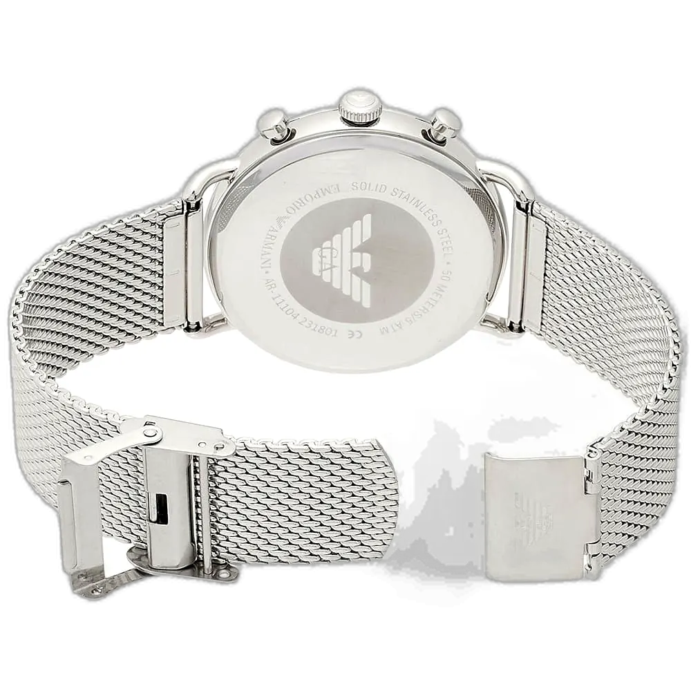 ساعة امبوريو ارماني Emporio Armani رجالي أصلية موديل (أفياتور) Aviator AR11104. بمينا لونها أسود و سوار من الستانلس ستيل بلون فضي، تصميم يجمع بين الأناقة الخالدة والروح العصرية.