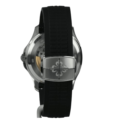 الميزة المحددة لـ ساعة باتيك فيليب أكواناوت هي سوارها المطاطي الأسود (Tropical Strap). هذا السوار مصنوع من مادة مركبة تقاوم التآكل والماء والـ UV، مما يوفر متانة قصوى وراحة فائقة، وهو مثالي للاستخدام النشط. يتم تأمين السوار بمشبك قابل للطي يحمل توقيع باتيك فيليب.