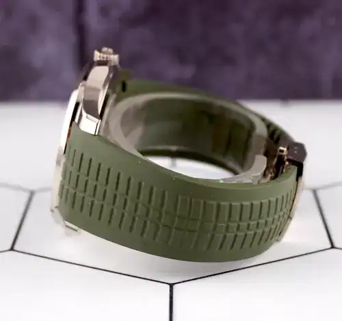 الميزة المحددة لـ ساعة باتيك فيليب أكواناوت هي سوارها المطاطي الأخضر (Tropical Strap). هذا السوار مصنوع من مادة مركبة تقاوم التآكل والماء والـ UV، مما يوفر متانة قصوى وراحة فائقة، وهو مثالي للاستخدام النشط. يتم تأمين السوار بمشبك قابل للطي يحمل توقيع باتيك فيليب.