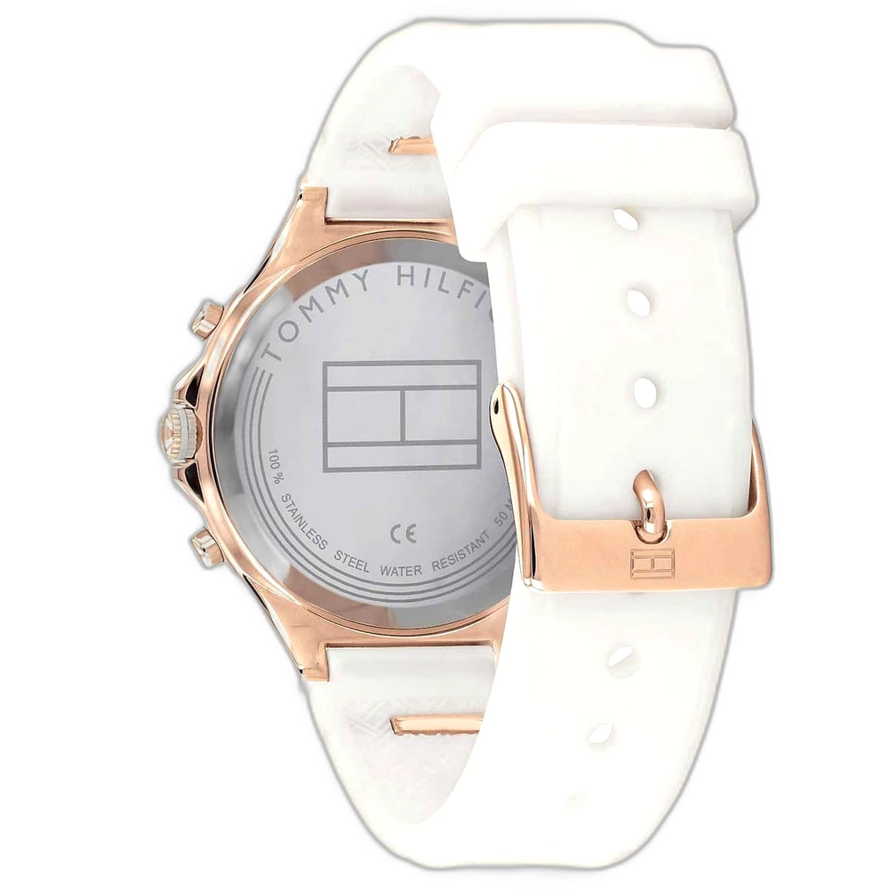ساعة تومي هيلفيغر Tommy Hilfiger حريمي أصلية موديل (ايف) 1782280 Eve. الرقم المصنعي TH.409.3.34.2960S. بمينا لونها أبيض وسوار من الستانلس ستيل والمطاط (سيليكون) بلون أبيض ونحاسي.