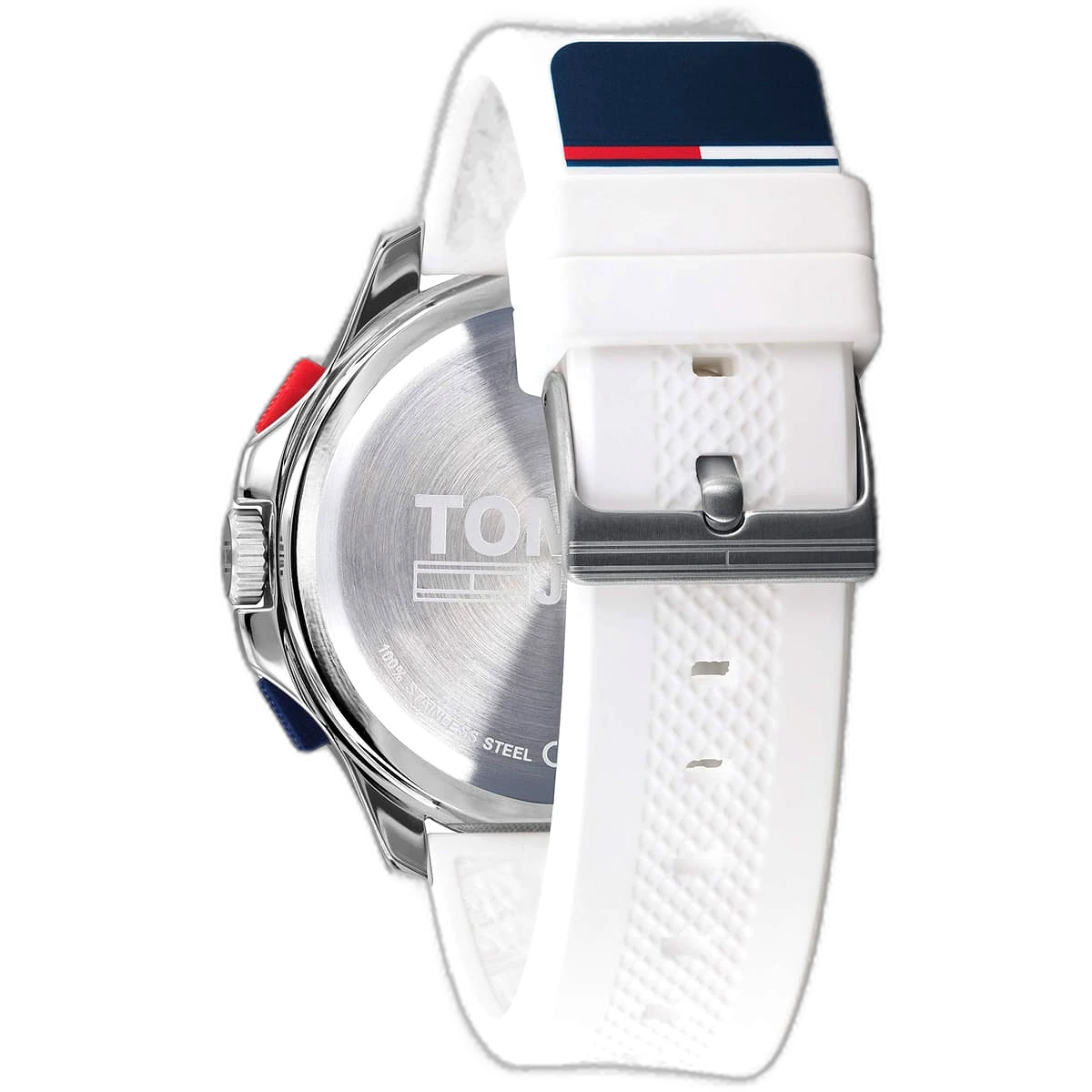 ساعة تومي هيلفيغر Tommy Hilfiger رجالي أصلية موديل (جينز) 1791764 Jeans. الرقم المصنعي TH.362.1.14.2871. بمينا لونها فضي و سوار مطاط (سيليكون) بلون أبيض.
