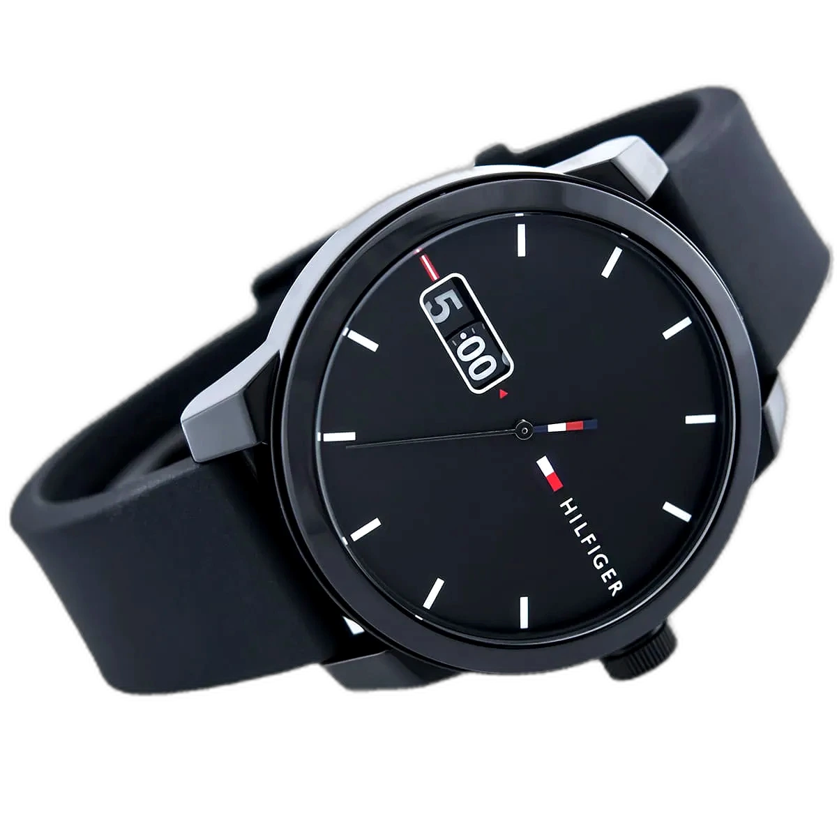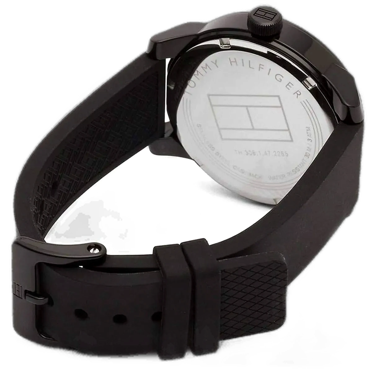 ساعة تومي هيلفيغر Tommy Hilfiger رجالي أصلية موديل (دنيم) 1791382 Denim. الرقم المصنعي TH.306.1.47.2265. بمينا لونها أسود و سوار من المطاط (سيليكون) بلون أسود.