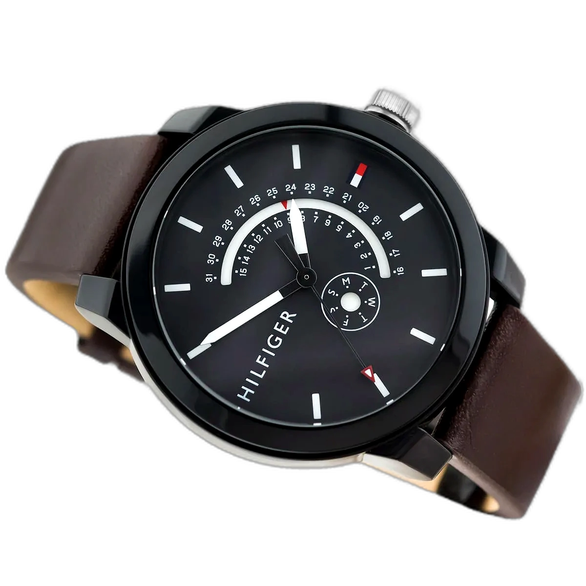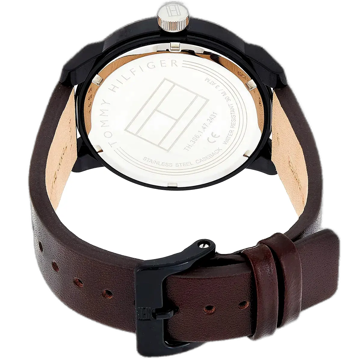 ساعة تومي هيلفيغر Tommy Hilfiger رجالي أصلية موديل (دنيم) 1791478 Denim. الرقم المصنعي TH.306.1.47.2431. بمينا لونها أسود و سوار من الجلد الطبيعي بلون بني.
