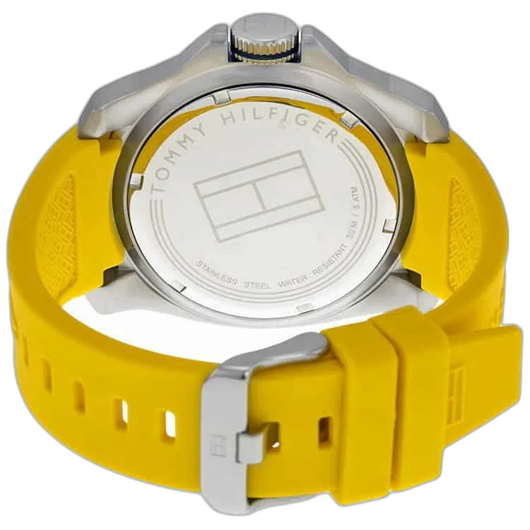 ارفع مستوى أناقتك مع ساعة تومي هيلفيغر الأصلية، موديل 1791115 (ويند سيرف). تتميز هذه الساعة بمينا بيضاء نقية وسوار من المطاط (سيليكون) الأصفر اللافت.
