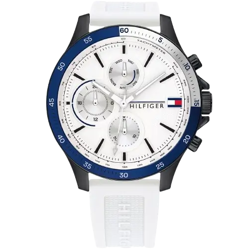 يرتكز المظهر الأساسي لـ ساعة تومي هيلفيغر 1791723 على التأثير القوي والأنيق للون الأبيض الكامل وتفاصيل الوظائف. تم تصنيع العلبة الدائرية (46 ملم تقريباً) بدقة من الستانلس ستيل المتين ومطلية باللون الأبيض الموحد والمصقول. النقطة المحورية هي الميناء الأبيض الآسر، والذي يوفر خلفية نظيفة ومتطورة. هذا الموديل هو كرونوغراف وظيفي، حيث يضم موانئ فرعية تقيس الدقائق، والثواني، والوقت بصيغة 24 ساعة، مما يمنحه طابعاً مستوحى من سباقات السيارات. يتميز الميناء بشعار علم العلامة التجارية المميز، مؤكداً على هويتها الأمريكية في سياق لوني موحد.