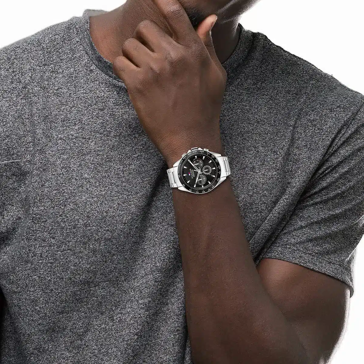 يرتكز المظهر الأساسي لـ ساعة تومي هيلفيغر 1791967 على التباين الدرامي بين الأسود واللمعان الفضي. تم تصنيع العلبة الدائرية (44 ملم تقريباً) بدقة من الستانلس ستيل المتين بلمسة نهائية فضية مصقولة، مما يوفر إطاراً نظيفاً للميناء. النقطة المحورية هي الميناء الأسود الآسر، والذي يوفر خلفية قوية ومتطورة. هذا الموديل يتميز بتصميم ميناء نظيف وبسيط بثلاثة عقارب، مما يؤكد على أناقته غير المزدحمة. يتميز الميناء بشعار علم العلامة التجارية المميز، مؤكداً على هويتها الأمريكية. تستخدم الساعة مؤشرات جريئة، مما يضمن وضوحاً وسهولة في القراءة ضد الخلفية السوداء.