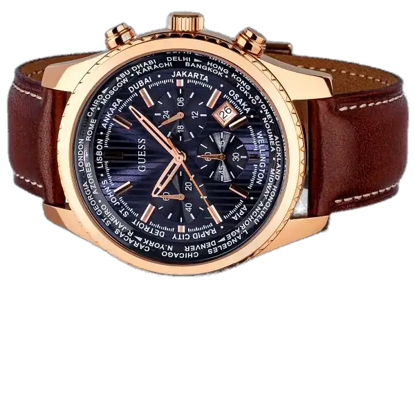 تقدم ساعة جيس برسيوت W0500G1 مظهراً كلاسيكياً راقياً يتميز بتباين لوني لافت. تتميز بـ مينا زرقاء جريئة ومتعددة الوظائف داخل هيكل فضي (44 مم)، وتتكامل بشكل جميل مع استيك جلد طبيعي بني غني. إنها مزيج مثالي من الأناقة التقليدية والفائدة اليومية.