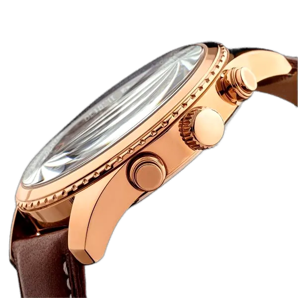 تتمحور الساعة حول هيكل دائري قوي بقطر 44 مم، مصنوع من الستانلس ستيل الفضي المصقول عالي الجودة. حجمها جذاب دون أن يكون مبالغاً فيه على المعصم. الميزة المميزة التي تجعل هذه الساعة فريدة هي استيك الجلد الطبيعي البني الغني. يوفر الجلد راحة فائقة وملمساً كلاسيكياً، ويتطور ليمنحها مظهراً فريداً بمرور الوقت. يُغلق بإبزيم كلاسيكي فضي. الساعة محمية ضد الماء بمعدل 50 متراً (5 ATM).