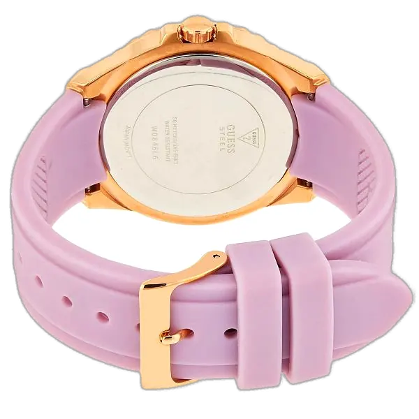 للتأكيد على الطابع الرياضي-الفاخر، تم تزويد ساعة جيس ستار لايت W0846L6 بسوار من المطاط (السيليكون) بلون أرجواني (Purple) حيوي وجذاب. مادة السيليكون تضمن راحة استثنائية للمعصم، وهي مقاومة للعرق والرطوبة، مما يجعل الساعة مناسبة تماماً للاستخدام اليومي والأنشطة الخارجية والرياضية الخفيفة. يتم تثبيت السوار بواسطة إبزيم تقليدي محكم يضمن الثبات والراحة طوال اليوم.