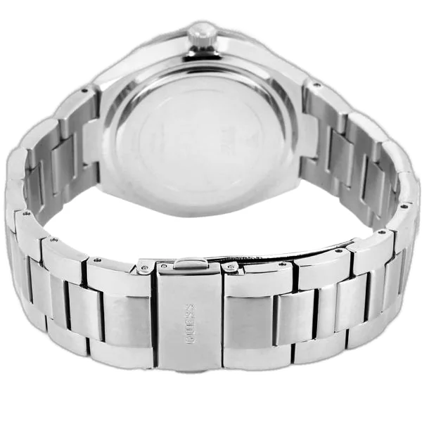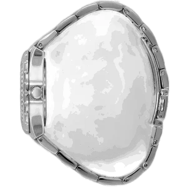 السوار المصاحب للساعة مصنوع من الستانلس ستيل باللون الفضي، بتصميم سوار (Bracelet) تقليدي مصقول ومناسب للاستخدام اليومي المستمر. يُغلق السوار بإبزيم طيار (Pilot Buckle) أو قفل قابل للطي بضغطة زر، مما يضمن ثباتها وأمانها على المعصم.