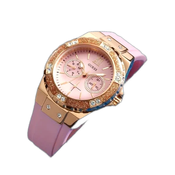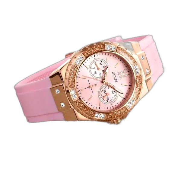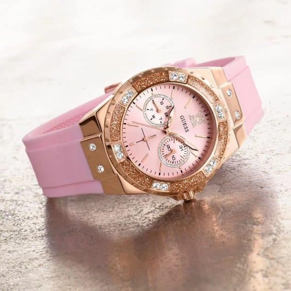 تألقي كل يوم بالألوان والمرح! ساعة جيس لايم لايت W1053L3 تأتيك بمينا وردي ساحر، مع سوار سيليكون وردي ناعم، وإطار ذهبي وردي مرصع بالكريستال ليضيف لمسات فاخرة على كل إطلالة. الساعة المثالية للمرأة المصرية الباحثة عن الجمال والثقة.