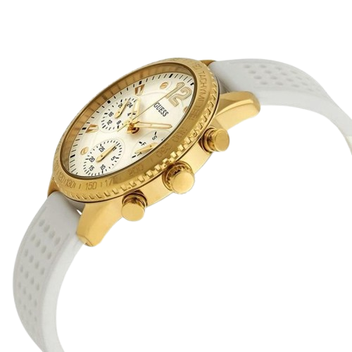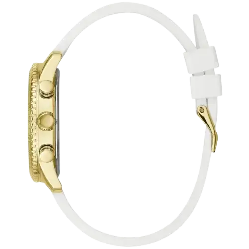 واحدة من أبرز ميزات ساعة جيس W1025L5 هي سوار السيليكون الأبيض الأنيق. هذه المادة عالية الجودة توفر مرونة استثنائية وراحة، تتكيف بسلاسة مع معصمك للارتداء طوال اليوم. على عكس الأساور المعدنية التي قد تكون ثقيلة أو مقيدة، فإن سوار السيليكون خفيف الوزن (حوالي 85 جرام إجمالي وزن الساعة) وقابل للتنفس.