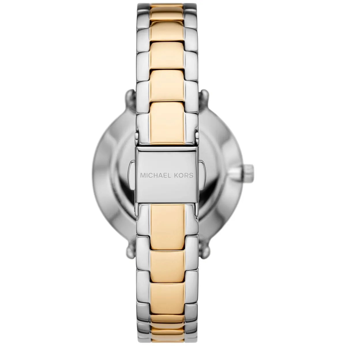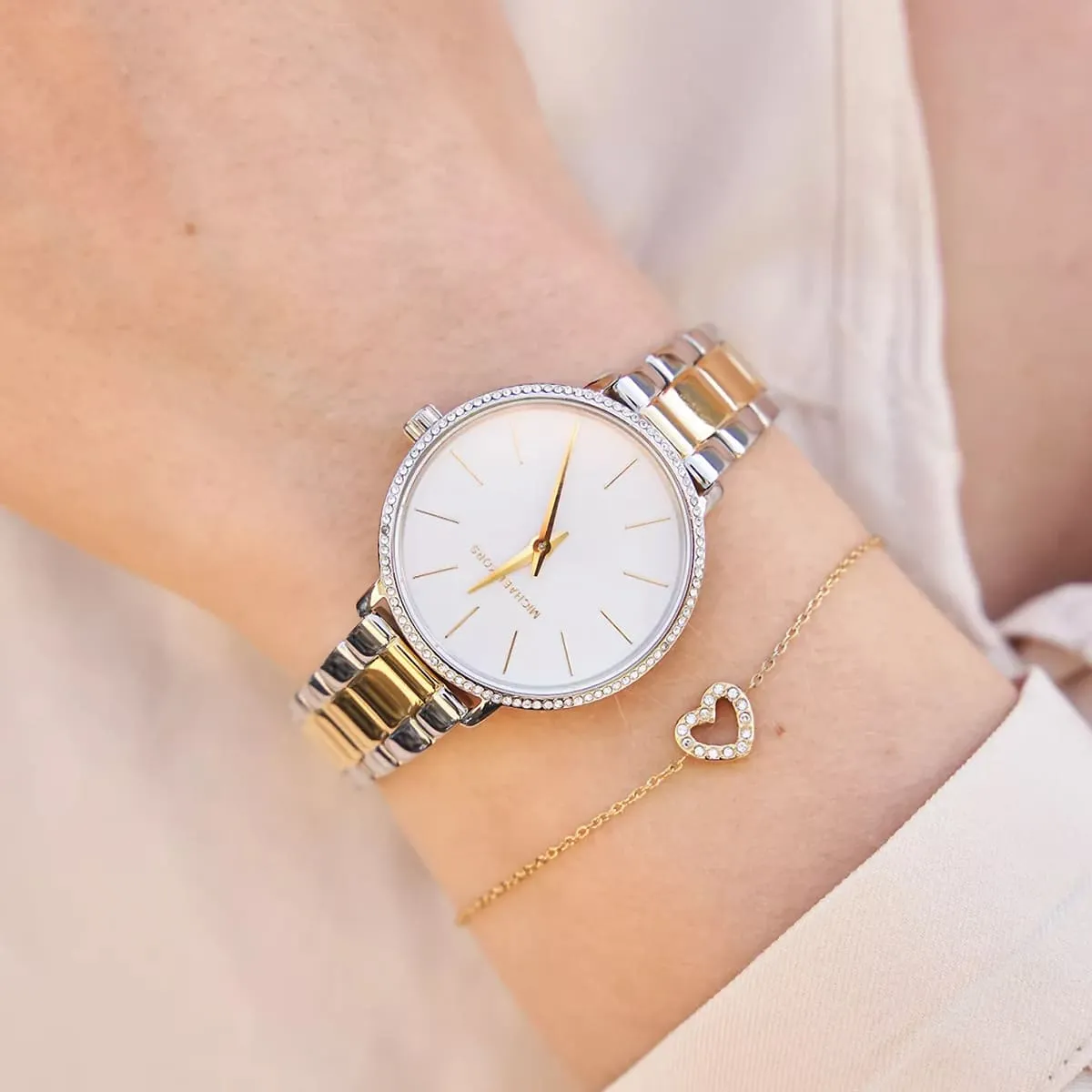يعتمد تصميم MK1041 على التباين الأنيق والمحسوب بعناية فائقة. تم بناء الهيكل الأساسي للساعة على بريق اللون الفضي الكلاسيكي المصنوع من الستانلس ستيل، والذي يتم تزيينه بلمسات من الطلاء الذهبي الدافئ على الإطار الخارجي ووصلات السوار المركزية. هذا الجمع المزدوج للونين هو ما يمنح الساعة مرونتها الفريدة. الحجم الصغير (ميني) 33 ملم يضمن ملاءمة رقيقة وأنثوية للرسغ، مع المحافظة على أقصى درجات التألق والحضور البصري.