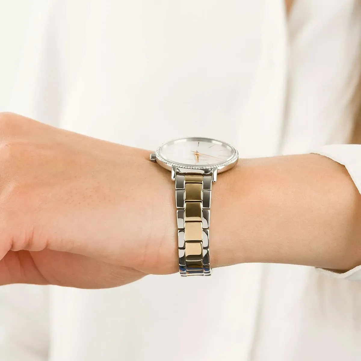 الميناء الأبيض الساطع هو الخلفية المحايدة المثالية، مما يضمن وضوح قراءة الوقت للأيدي الذهبية والفضي. تمثل علامات الساعات ببلورات الكريستال المرصع (Pavé accents) الصغيرة واللامعة، مما يضيف لمسة مايكل كورس المميزة من الفخامة دون أن يطغى على بساطة التصميم. هذا البريق الرقيق يضمن أن الساعة تلتقط الضوء ببراعة، مما يجعلها مصدر إشعاع باهر على معصمكِ. الساعة مدعومة بآلية كوارتز ثلاثية العقارب موثوقة، مما يوفر دقة واعتمادية عالية في قياس الوقت لروتينكِ اليومي. كما أن الواجهة محمية بزجاج كريستال معدني متين، يوفر مقاومة جيدة ضد الاستخدام اليومي والخدوش.