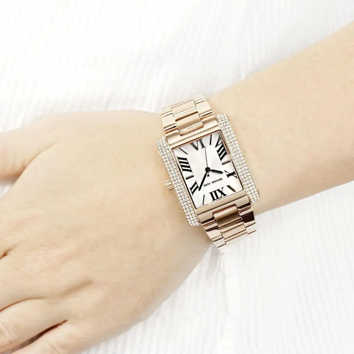 تُعد ساعة مايكل كورس MK3255 إضافة لا غنى عنها لأي مجموعة مجوهرات. بفضل توليفة الألوان الديناميكية بين النحاسي الدافئ والأبيض الساطع، والإطار المرصع بالكريستال اللامع، فإنها تمنحكِ لمسة من الرفاهية المشرقة وحضوراً جريئاً يعكس فخامة مايكل كورس.