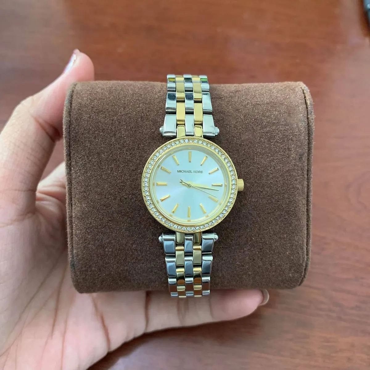 تُعد ساعة مايكل كورس MK3323 من مجموعة “دارسي بيتيت” (Darci Petite) مثالاً دقيقاً ومبهراً على كيفية تقديم الفخامة القصوى في تصميم صغير ورقيق. يُعد هذا الموديل خياراً مرغوباً بشدة لقدرته الفريدة على الجمع بين ترف الترصيع المستمر بالكريستال والمرونة المطلقة للتصميم ثنائي اللون (فضي وذهبي). صُممت MK3323 بقطر مصغر 33 ملم، وهو حجم يضمن ملاءمة أنثوية وراقية لأولئك اللاتي يفضلن الفخامة الهادئة والملفتة في آن واحد. هذه الساعة تجسد ببراعة توقيع مايكل كورس: أناقة جريئة ومصممة بدقة متناهية.