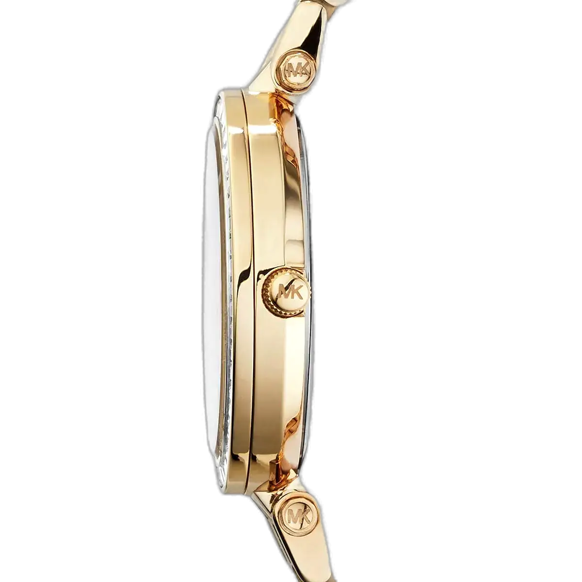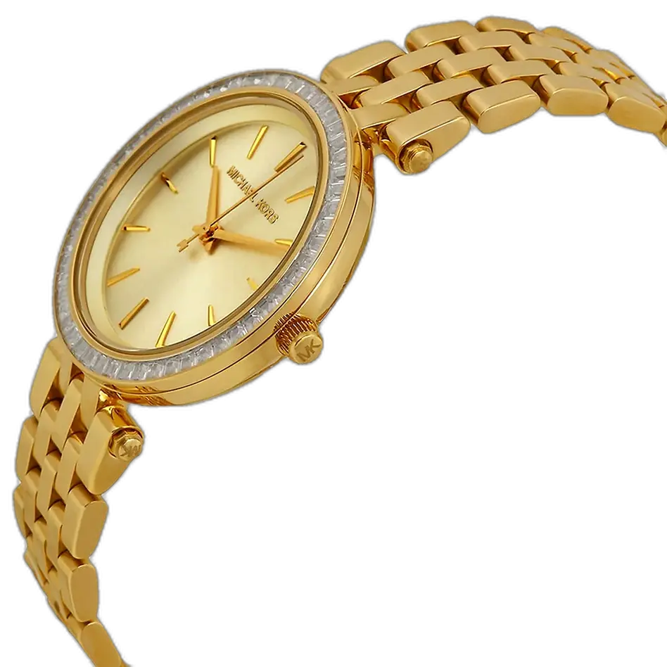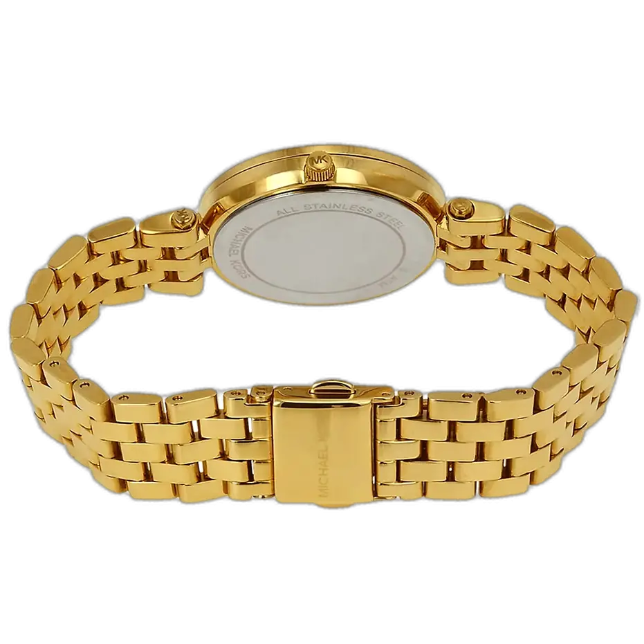 تصميم MK3365 هو احتفاء بالترف واللمعان. الهيكل بأكمله، من العلبة إلى السوار ثلاثي الحلقات، مصنوع من الستانلس ستيل المتين ومغطى بطلاء ذهبي غني وموحد. القطعة المحورية في الساعة هي توقيع “دارسي” المتمثل في الإطار المرصع بالكريستال (Pavé)، الذي يلتقط الضوء من كل زاوية، مما يخلق هالة من التألق المستمر حول الميناء. الميناء نفسه يأتي بلون ذهبي مطابق أو مصقول للغاية، مما يضمن تدفقاً ثابتاً للدفء واللمعان على المعصم. هذا التركيز على لون معدني واحد وغني يميزها كخيار قصوى للمناسبات الرسمية أو لإضافة لمسة جريئة من الفخامة اليومية.