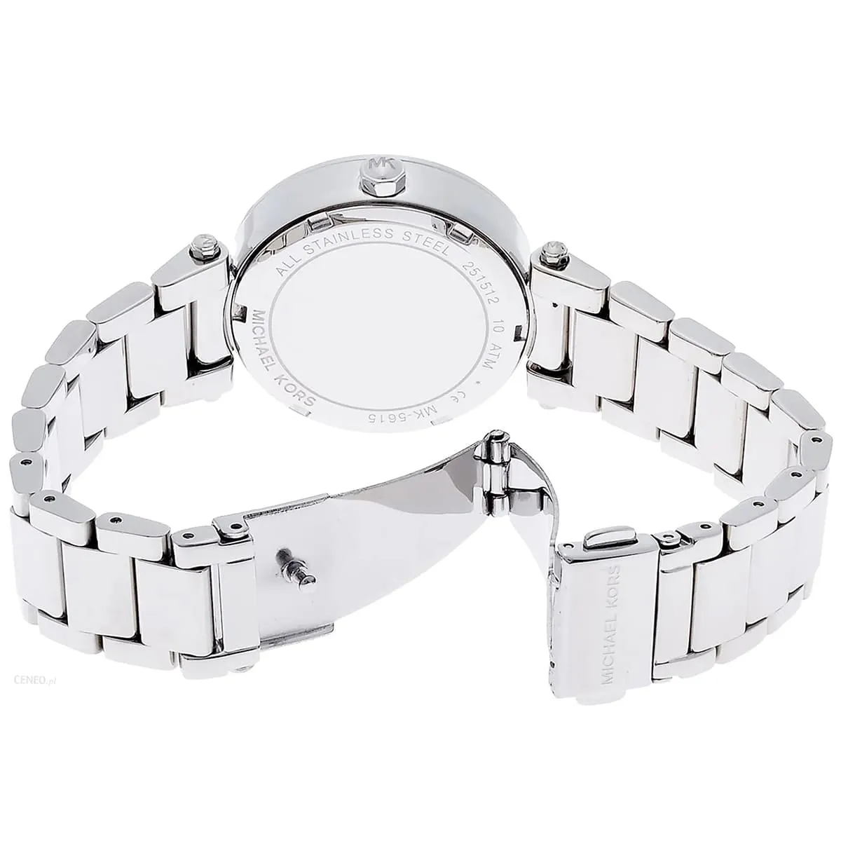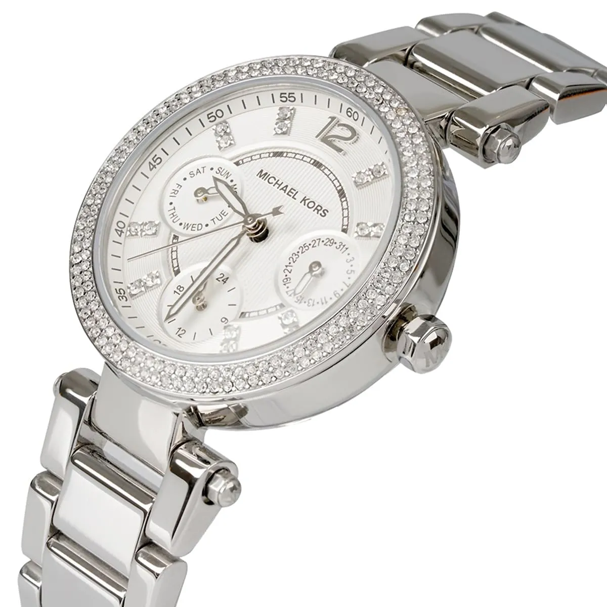 يرتكز التصميم الأساسي لـ MK5615 على التوازن بين الهيكل الرياضي القوي والمظهر اللامع. العلبة مصنوعة ببراعة من الستانلس ستيل المتين ومطلية بالكامل باللون الفضي المشرق. تتميز العلبة ذات حجم 39 ملم بأنها مغطاة بالكامل بصفوف من كريستال البافيه (Pavé crystals) على الإطار، مما يحوّل الساعة إلى قطعة مجوهرات براقة. الميناء يتميز بلمسة نهائية فضية متطابقة، حيث يتم تنظيم موانئ الكرونوغراف الفرعية الثلاثة بشكل واضح، مما يؤكد على وظيفتها الرياضية. المؤشرات والعقارب واضحة، وتكمل المظهر الفاخر للساعة.