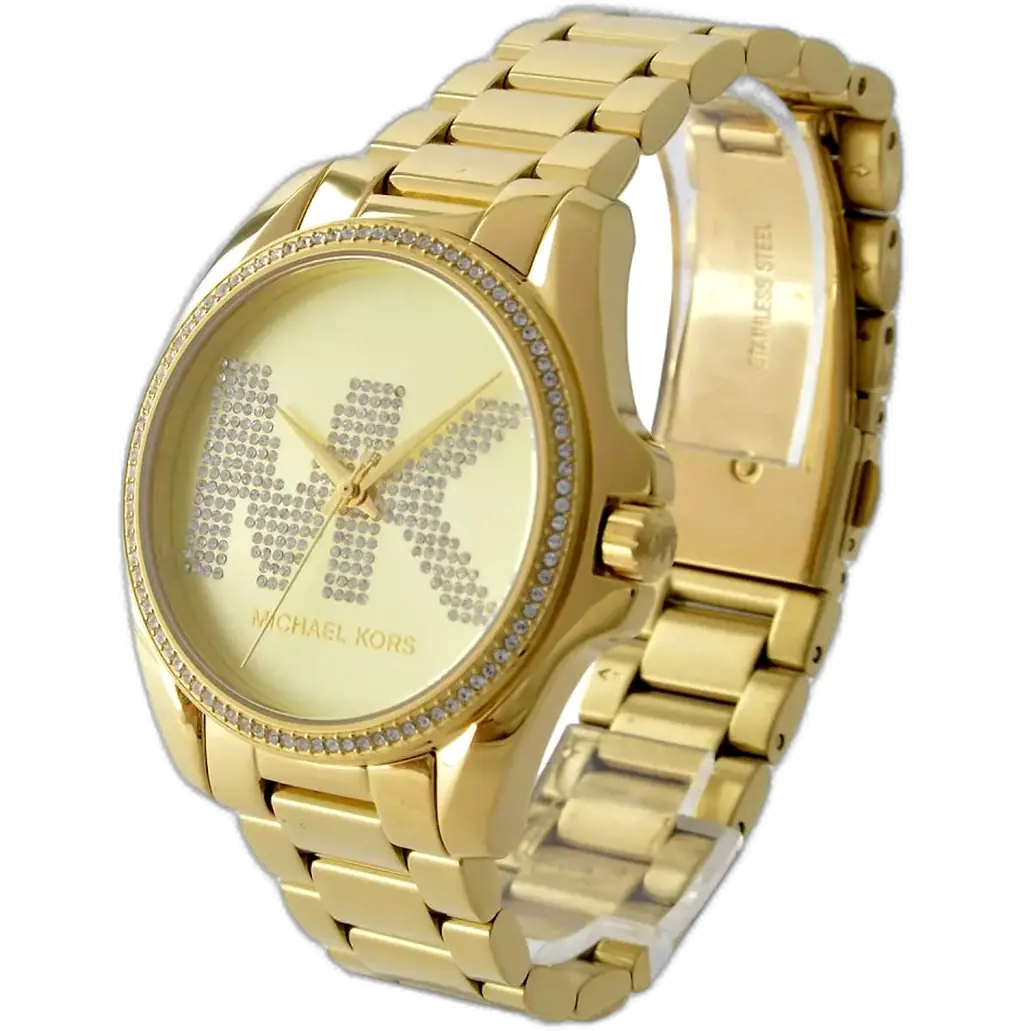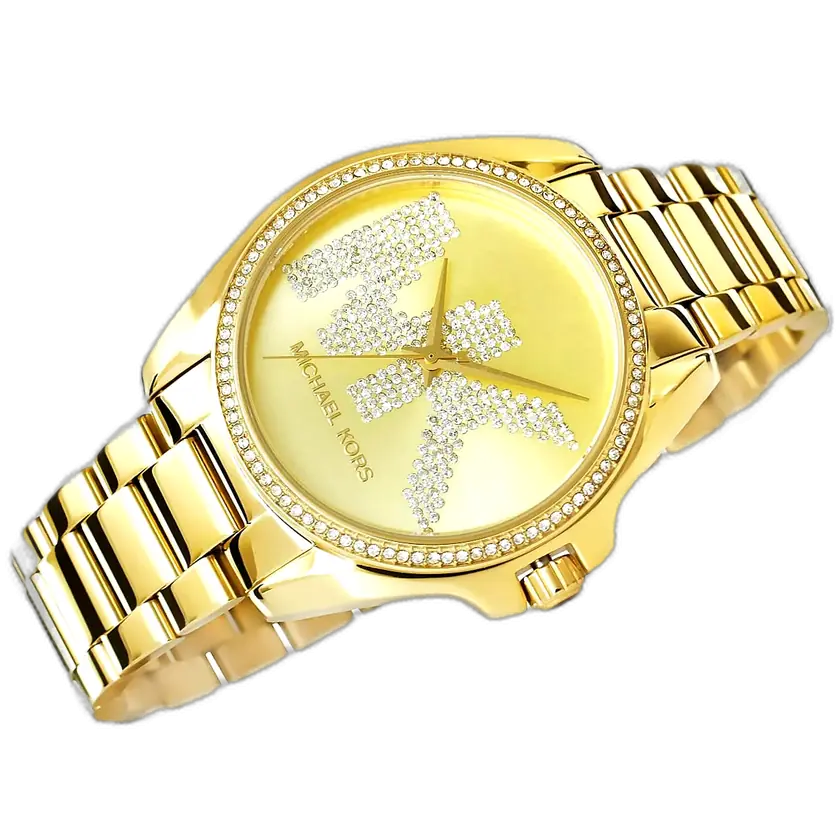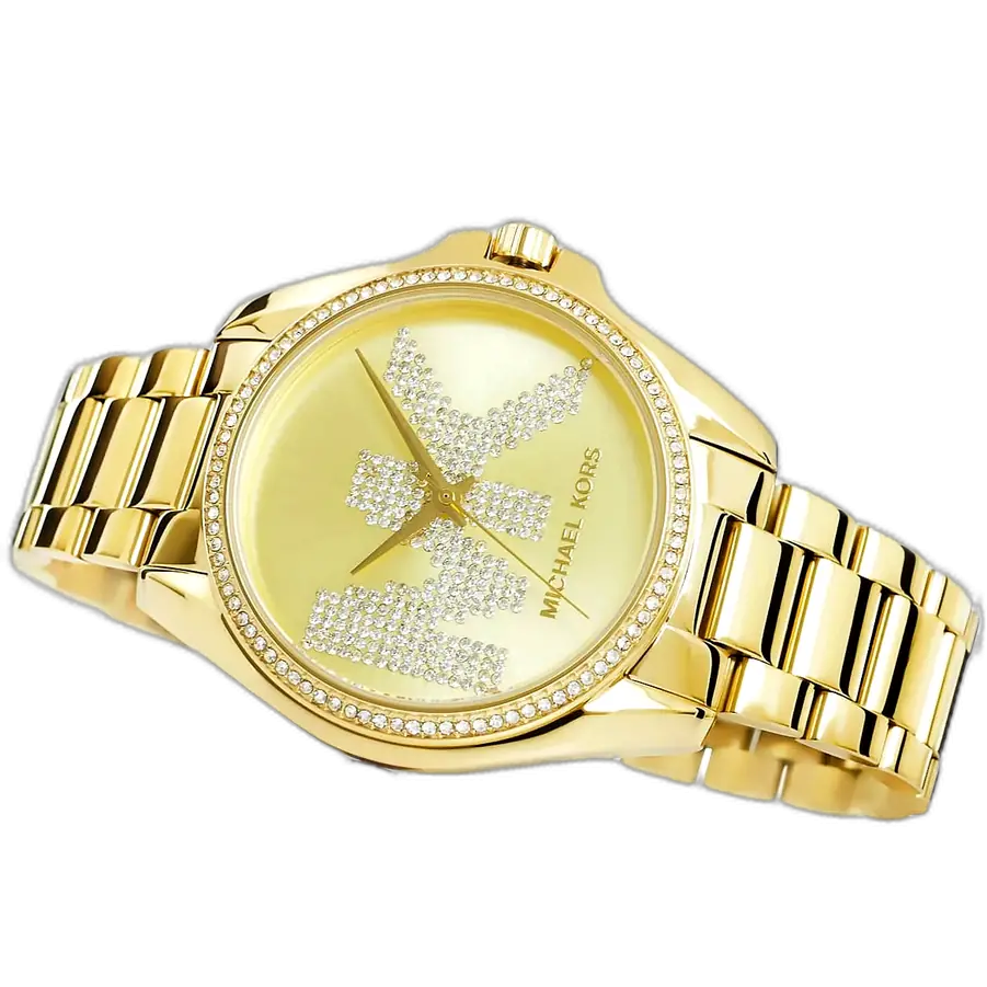 يرتكز التصميم الأساسي لـ ساعة مايكل كورس MK6555 على التزامها بالرقي المترف للذهب. تتميز الساعة بحجم كبير 43 ملم، وهو حجم “أوفرسايز” جريء، ومصنوعة ببراعة من الستانلس ستيل المتين ومطلية بالكامل بطلاء ذهبي موحد وعالي اللمعان. الميزة الأبرز هي الإطار الذي يتميز بكونه مغطى بالكامل بصفوف من كريستال البافيه (Pavé crystals)، مما يحوّل الساعة إلى قطعة مجوهرات براقة. الميناء يتميز بلمسة نهائية ذهبية متطابقة، حيث يضم ثلاثة موانئ فرعية لخاصية الكرونوغراف، بالإضافة إلى الأرقام الرومانية الكلاسيكية. كما يظهر شعار MK بوضوح، مؤكداً هويتها الفاخرة.