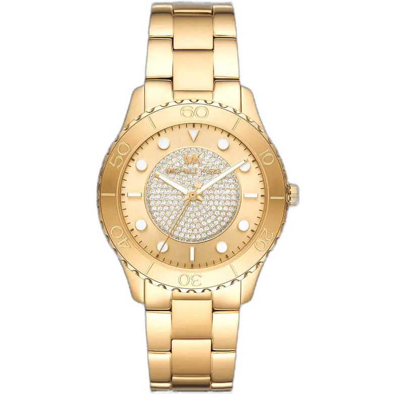 يرتكز التصميم الأساسي لـ ساعة مايكل كورس MK6911 على الالتزام باللون الذهبي المشع في جميع أجزائها، والمُعزز بالترصيع الكريستالي. تم تصنيع العلبة الدائرية (بقطر 40 ملم تقريباً) ببراعة من الستانلس ستيل ومطلية بالكامل بطلاء ذهبي موحد وعالي اللمعان. الإطار هو محور القطعة، حيث غالباً ما يكون مرصعاً بالكامل ببلورات الكريستال (Pavé)، مما يضيف توقيع مايكل كورس المميز بالبريق المستمر. الميناء مُجهز بلمسة نهائية ذهبية مطابقة ومضيئة، مما يعزز الجمالية الأحادية اللون. تستخدم الساعة مؤشرات بسيطة، مما يضمن الوضوح والتركيز على الترف المعدني.