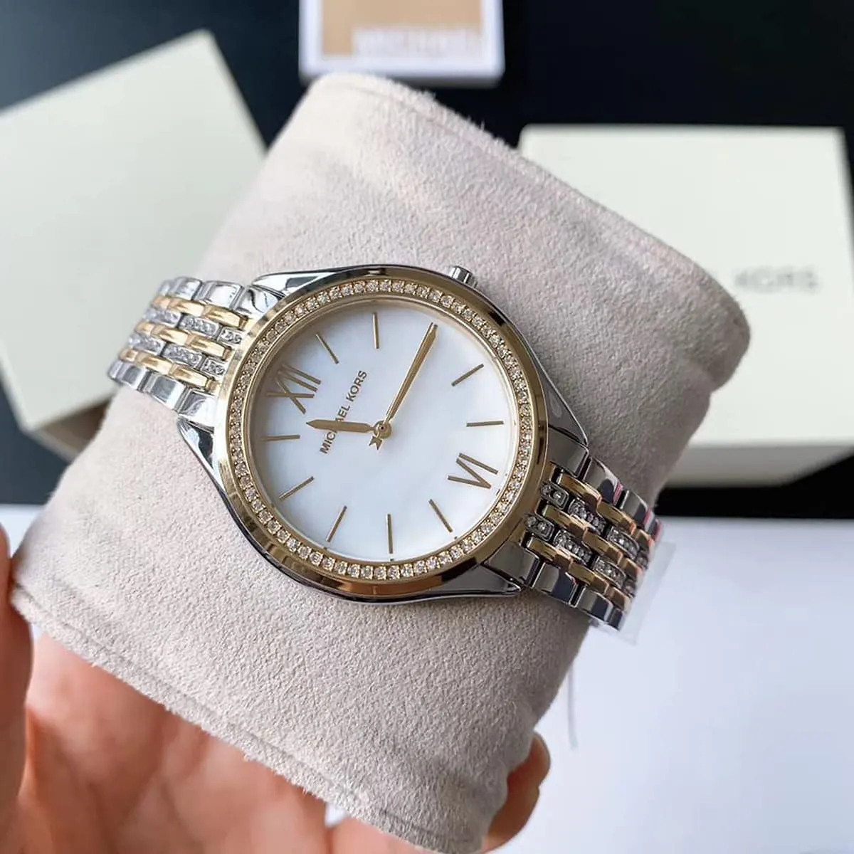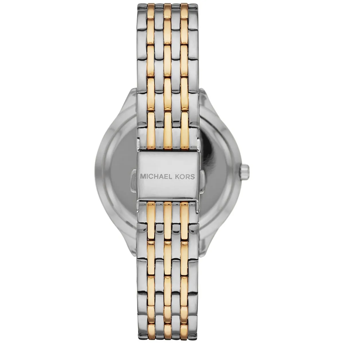 يرتكز التصميم الأساسي لـ ساعة مايكل كورس MK7084 على التناغم الاستراتيجي بين الفضي والذهبي. تم تصنيع العلبة الدائرية (بقطر 38 ملم تقريباً) ببراعة من الستانلس ستيل وتتميز بطلاء ثنائي اللون. اللون الفضي يشكل الهيكل الأساسي، بينما يضفي اللون الذهبي لمسة أنيقة على الإطار وتفاصيل السوار. الإطار هو محور القطعة، حيث غالباً ما يكون مرصعاً بالكامل ببلورات الكريستال (Pavé)، مما يضيف توقيع مايكل كورس المميز بالبريق المستمر. الميناء مُجهز بلمسة نهائية بيضاء ناصعة، والتي توفر التباين المثالي مع الإطار. تستخدم الساعة مؤشرات بسيطة، مما يضمن الوضوح والتركيز على الترف المعدني.