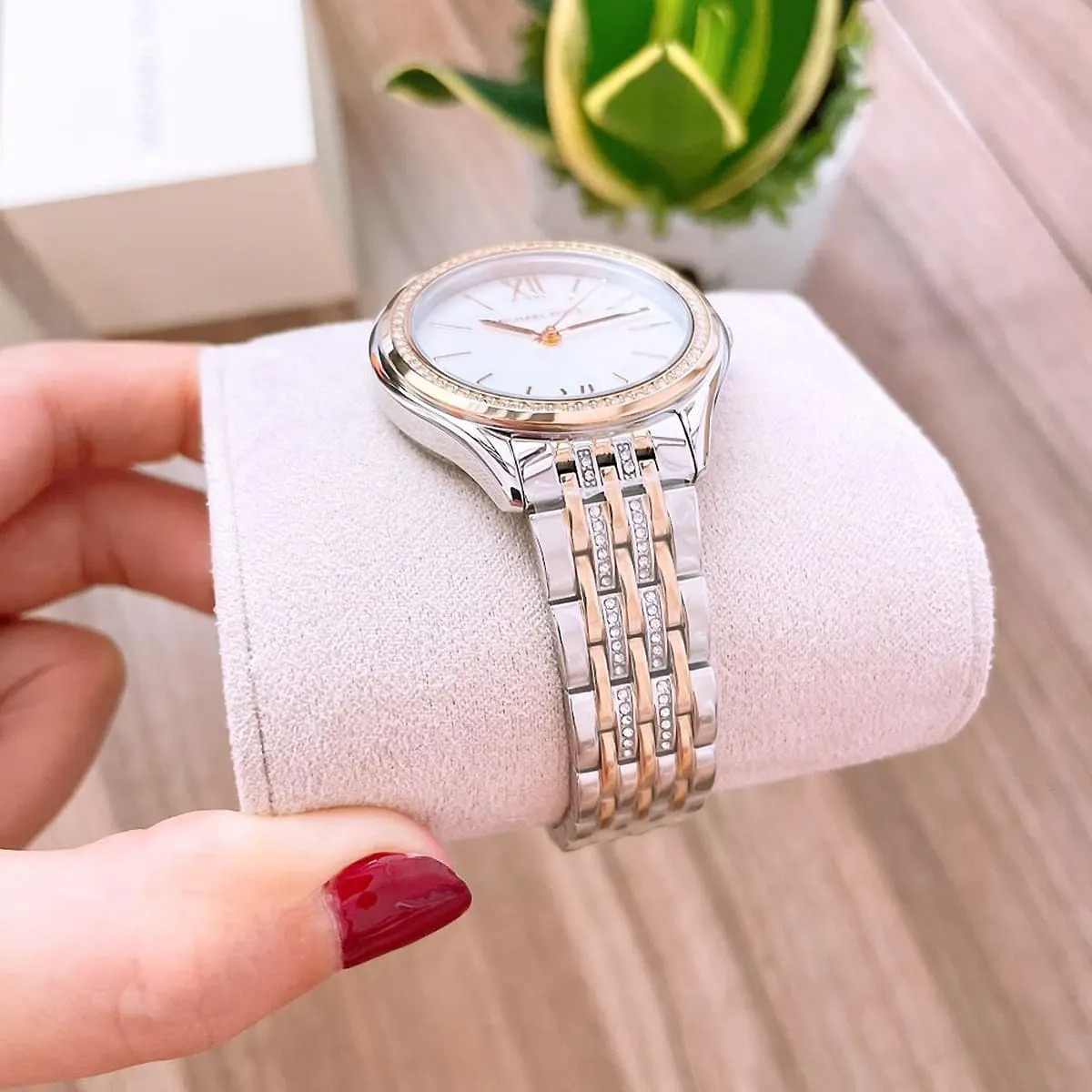 تُعد ساعة مايكل كورس MK7084 إكسسواراً حاسماً لأسلوب باهر وعالي التأثير. يمنحها مظهرها ثنائي اللون (الفضي والذهبي)، وتصميم “ميندي” الأنثوي، والترصيع الكريستالي، لمسة فاخرة ومميزة، مما يجعلها الإضافة المثالية لمجموعة إكسسواراتكِ.