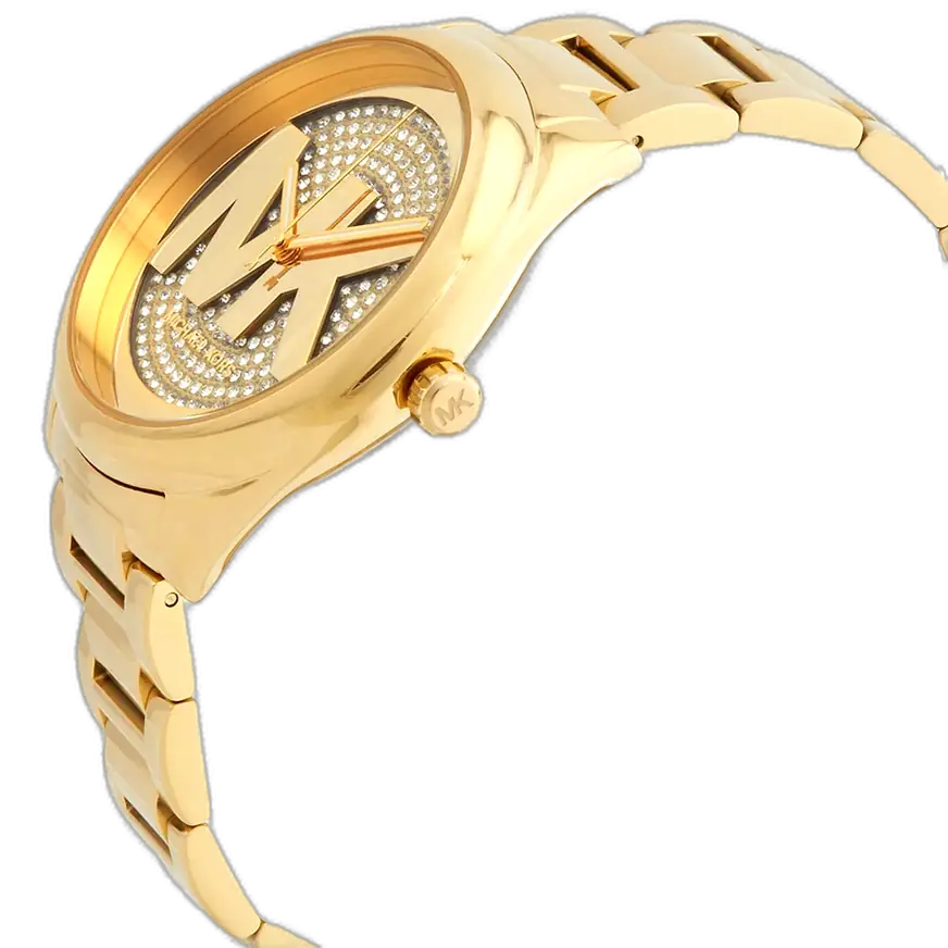 يرتكز التصميم الأساسي لـ ساعة مايكل كورس MK7088 على الالتزام باللون الذهبي المشع في جميع أجزائها. تم تصنيع العلبة الدائرية (بقطر 38 ملم تقريباً) ببراعة من الستانلس ستيل ومطلية بالكامل بطلاء ذهبي موحد وعالي اللمعان. الإطار بسيط ومصقول، مما يؤكد على الخطوط النظيفة. الميناء مُجهز بلمسة نهائية ذهبية مطابقة ومضيئة، مما يعزز الجمالية الأحادية اللون. تستخدم الساعة مؤشرات بسيطة على شكل خطوط مستقيمة، مما يضمن الوضوح والتركيز على الترف المعدني. الأهم من ذلك، يظهر شعار MK بوضوح على الميناء، مؤكداً هويتها الفاخرة.