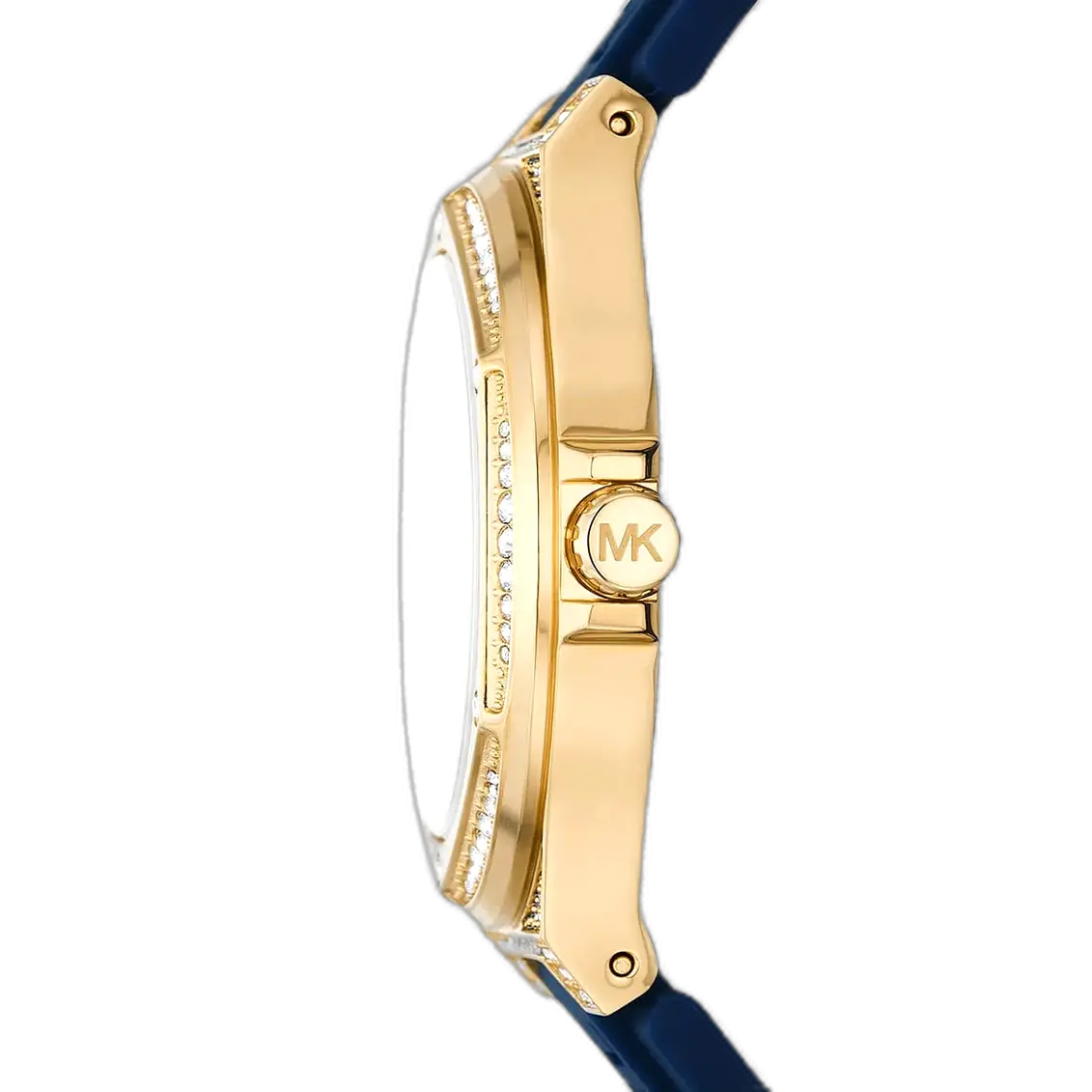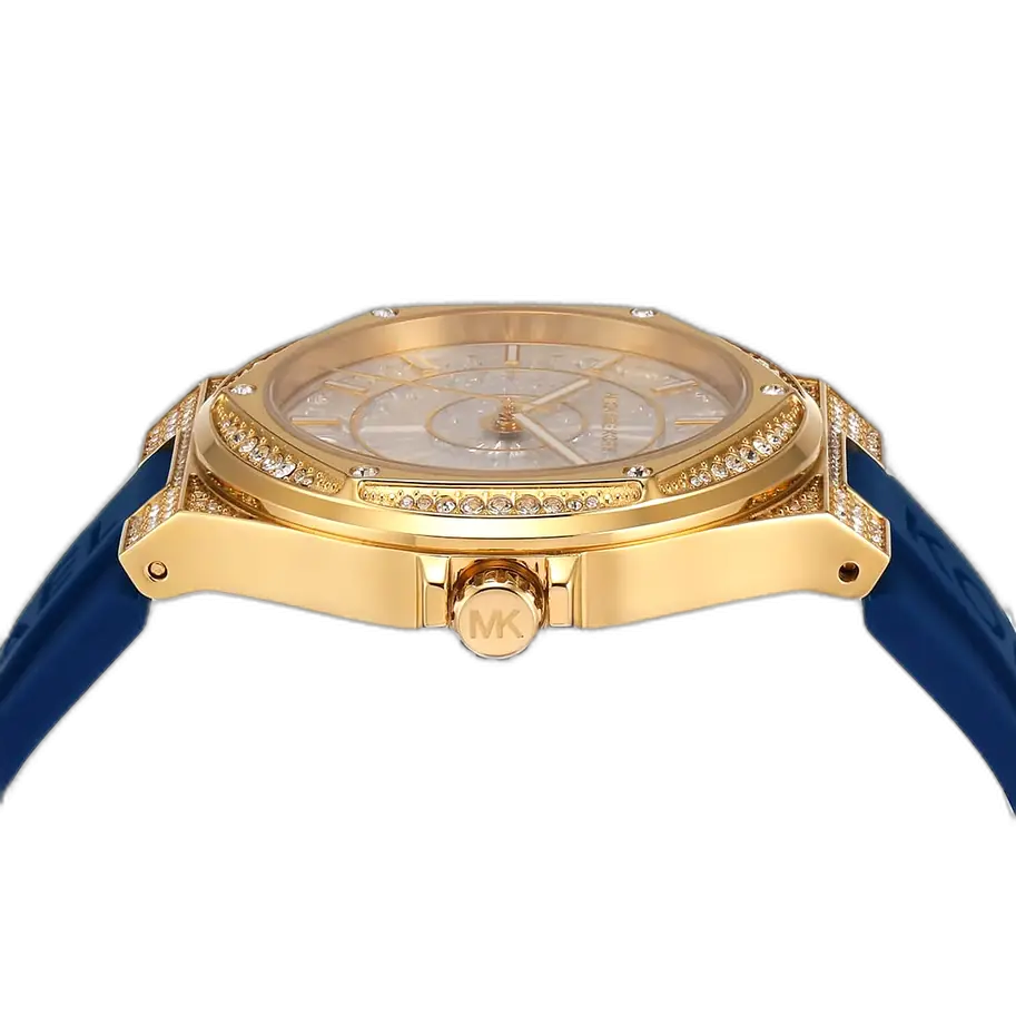 يرتكز التصميم الأساسي لـ ساعة مايكل كورس MK7333 على التفاعل القوي بين الأبيض المشرق والأزرق الجريء. العلبة الدائرية (38 ملم تقريباً) مصنوعة ببراعة من الستانلس ستيل ومطلية بلون فضي أو لون متناسق. يتميز الميناء بلمسة نهائية بيضاء نقية، مما يوفر وضوحاً استثنائياً. يستخدم الإطار كريستالات Pavé مشرقة، مما يضيف لمسة من البريق المستمر. يظهر شعار MK بوضوح، مؤكداً على هويتها كقطعة مصمم عالمية. هذا التصميم يوازن بين المظهر الرياضي للسوار المطاطي والترف الذي يضيفه الكريستال.