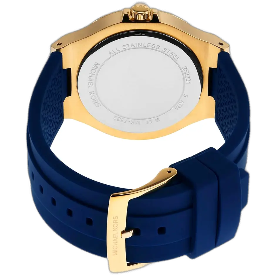 يعتبر سوار ساعة مايكل كورس MK7333 هو العنصر الأكثر عملية، حيث يوفر الراحة والتباين اللوني الأساسي. إنه سوار سيليكون مطاطي ناعم ومتين باللون الأزرق الجذاب. مادة السيليكون مثالية للارتداء اليومي والنشاط، حيث أنها مقاومة للماء وسهلة التنظيف وتوفر شعوراً مريحاً وخفيفاً على المعصم. التباين اللوني بين السوار الأزرق الجريء والميناء الأبيض المشرق يخلق مظهراً عصرياً وجذاباً. تتمتع الساعة بمعدل مقاومة للماء يبلغ 50 متراً (5 ATM)، مما يجعلها مناسبة تماماً للاستخدام اليومي.