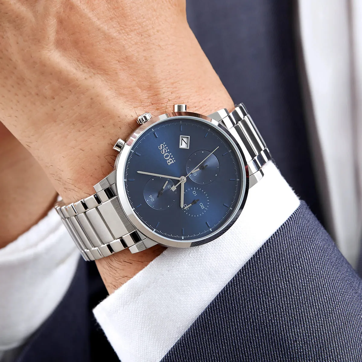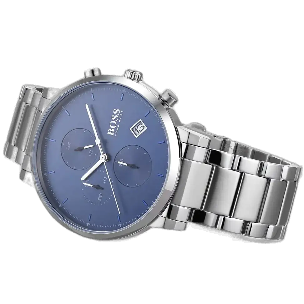 ارفع أناقتك الراقية مع ساعة هوجو بوس الأصلية للرجال، موديل (انتيجرتي) 1513779 كرونوغراف. تتميز هذه الساعة الراقية بمينا أزرق نابض بالحياة وسوار ستانلس ستيل فضي مصقول، لتجمع بين الفخامة العصرية والوظائف الدقيقة.