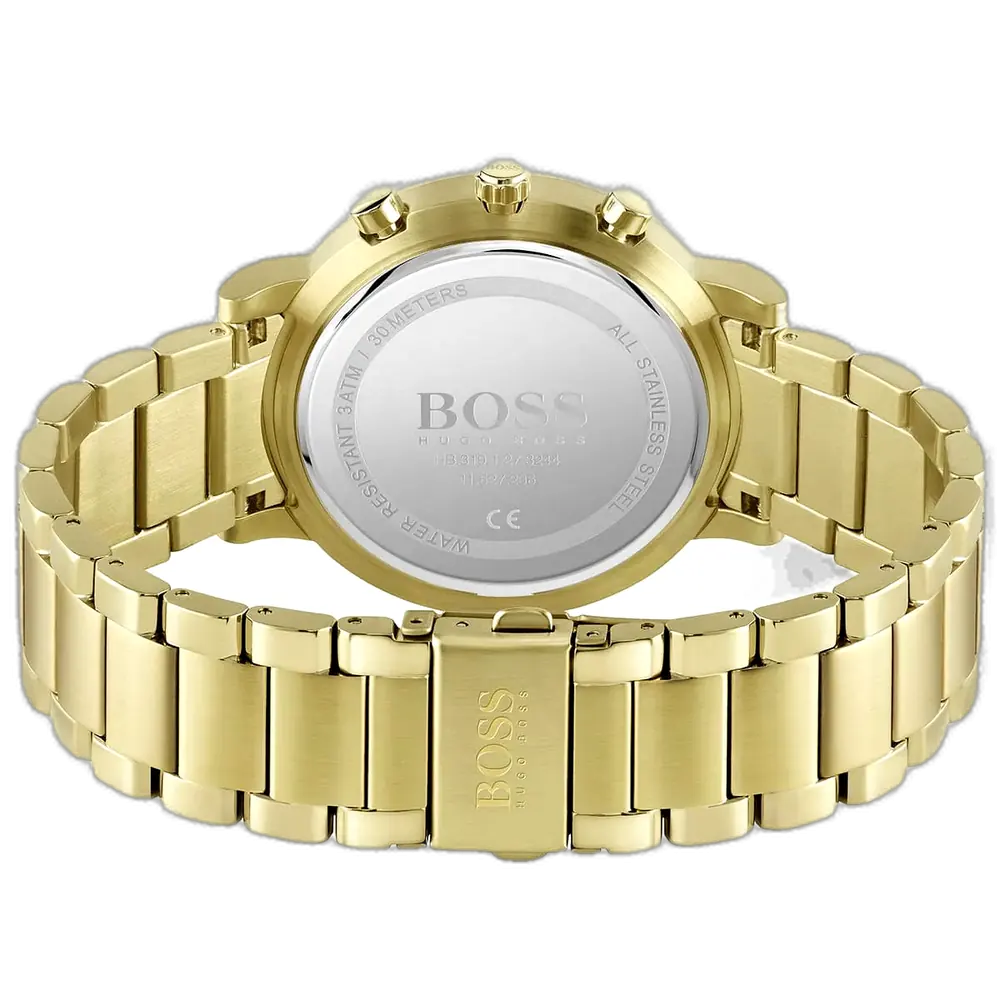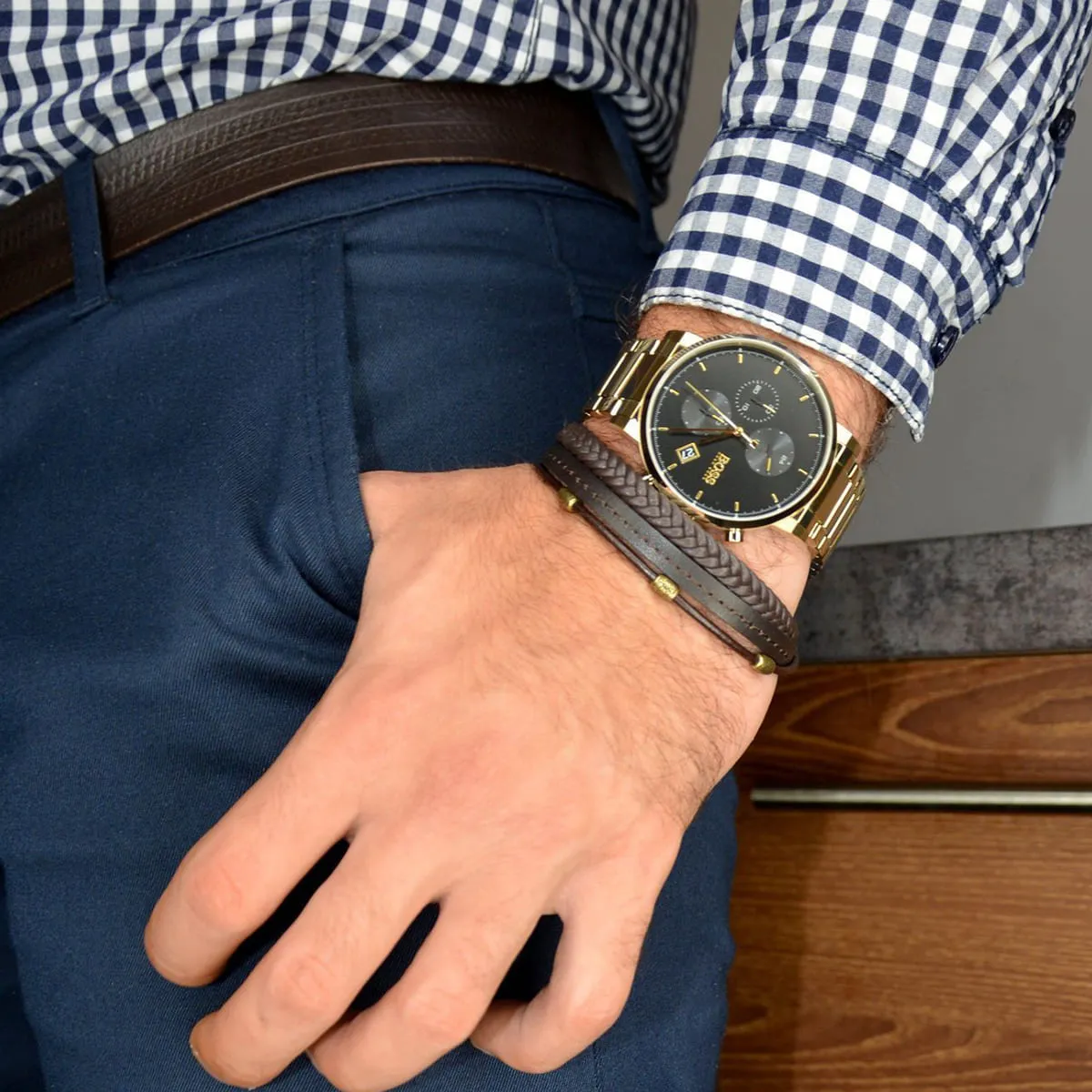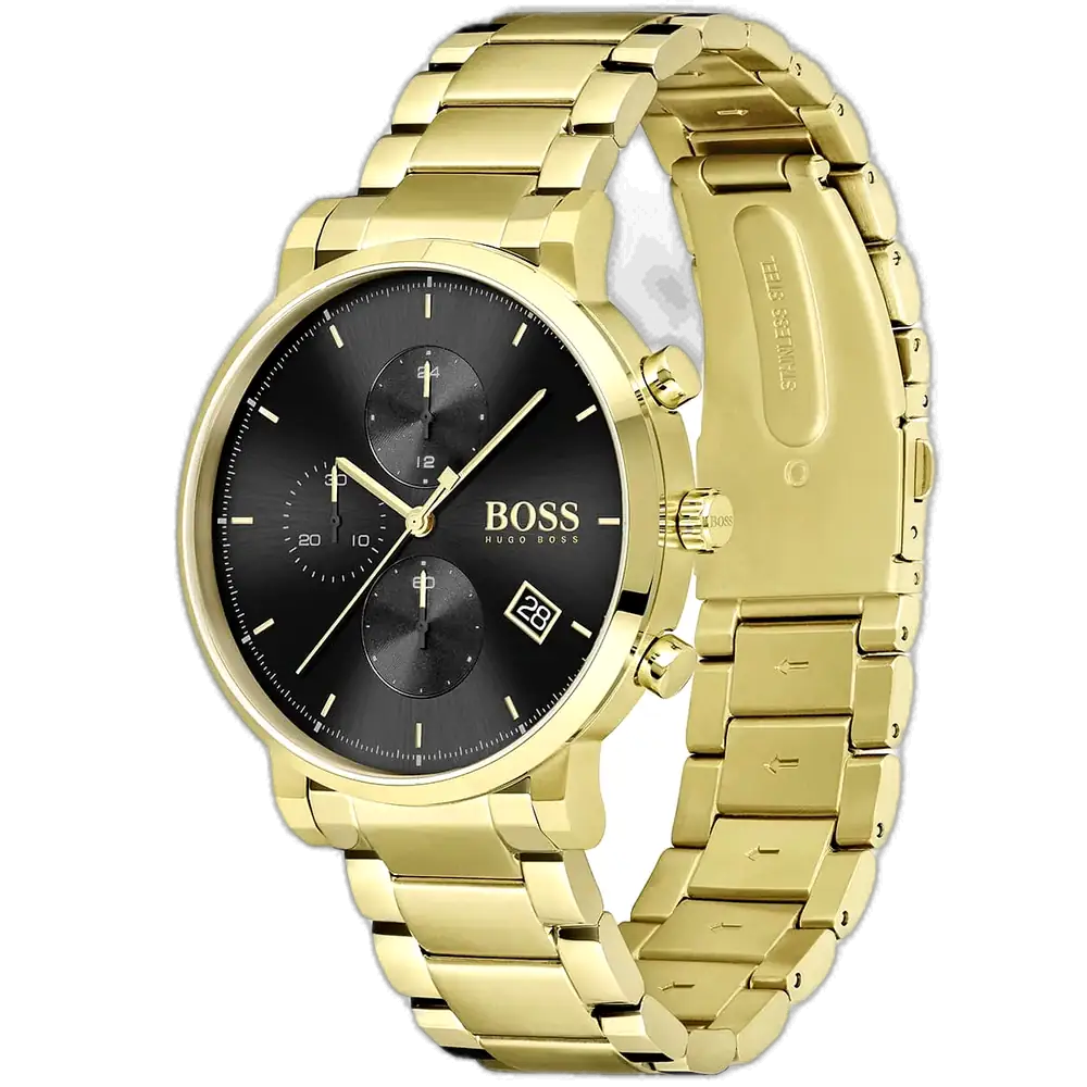 جسد جوهر الفخامة الراقية مع ساعة هوجو بوس انتيجرتي 1513781 كرونوغراف، الرقم المصنعي HB.397.1.34.3410، المصممة للرجل العصري الذي يقدر الأناقة والدقة. يشتهر هوجو بوس بحرفته الألمانية التي تجمع بين الفخامة والابتكار في هذه القطعة المميزة من مجموعة انتيجرتي. تتميز الساعة بهيكل قوي من الستانلس ستيل بلون ذهبي، يحتوي على مينا أسود إشعاع شمسي مذهل، مزين بعقارب ومؤشرات ذهبية مضيئة لتحسين القراءة. مجهزة بثلاثة عدادات فرعية لتوقيت الكرونوغراف، إطار تاخيميتر لقياس السرعة، ونافذة تاريخ عند 4:30، ومدعومة بحركة كوارتز يابانية موثوقة لضمان دقة لا تتزعزع. يضيف السوار الستانلس ستيل بلون ذهبي مع قفل دفعة الزر لمسة من الفخامة، مما يجعلها مثالية للإعدادات الرسمية والمهنية.