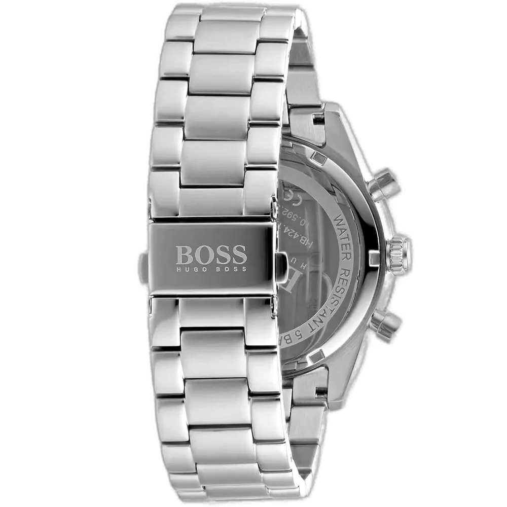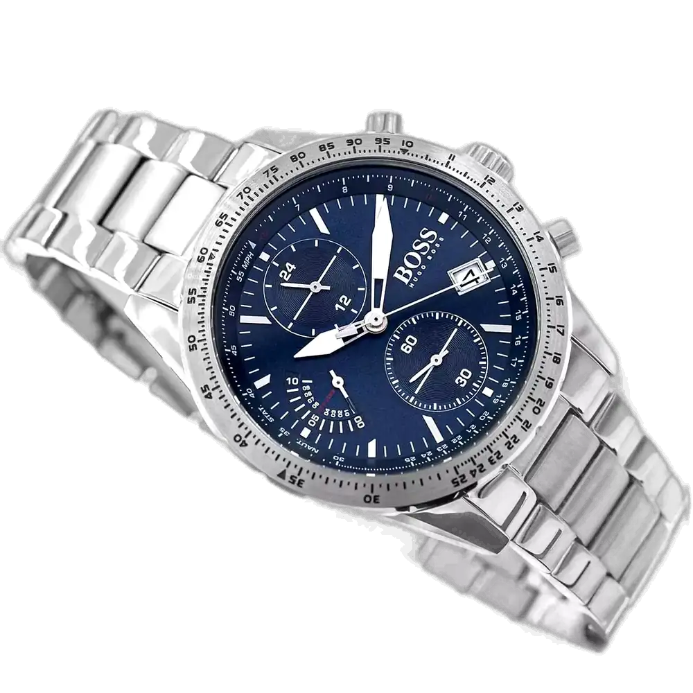 ارتقِ بأناقتك إلى آفاق جديدة مع ساعة هوجو بوس الأصلية للرجال، موديل (بايلوت اديشن كرونو) 1513850 كرونوغراف. تتميز هذه الساعة البارزة بمينا أزرق نابض بالحياة وسوار ستانلس ستيل مصقول باللون الفضي، لتجمع بين الفخامة المستوحاة من الطيران والوظائف الدقيقة.
