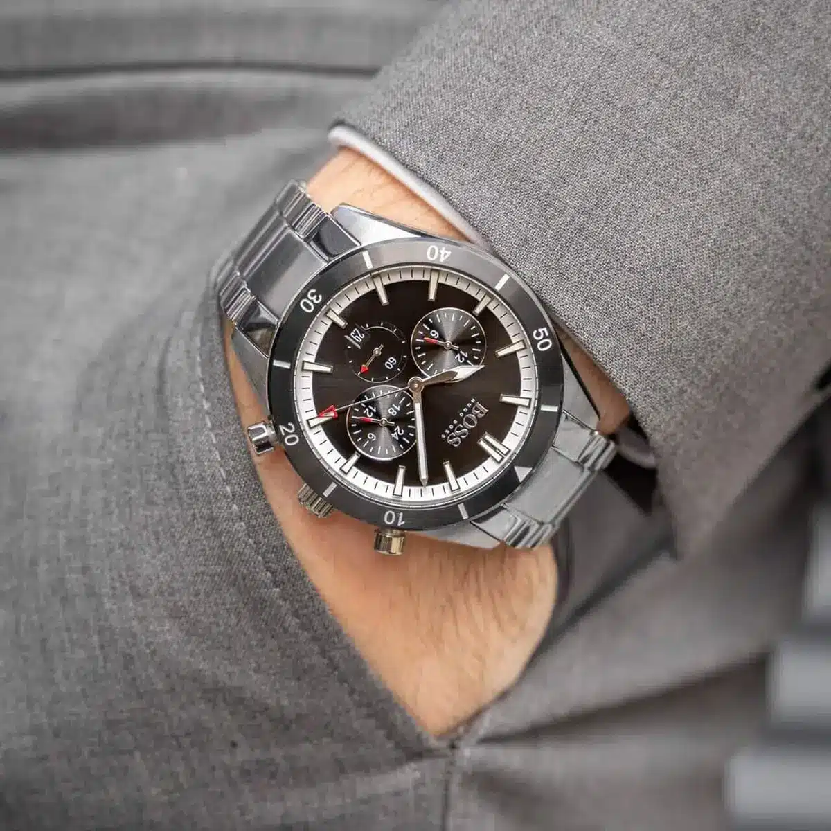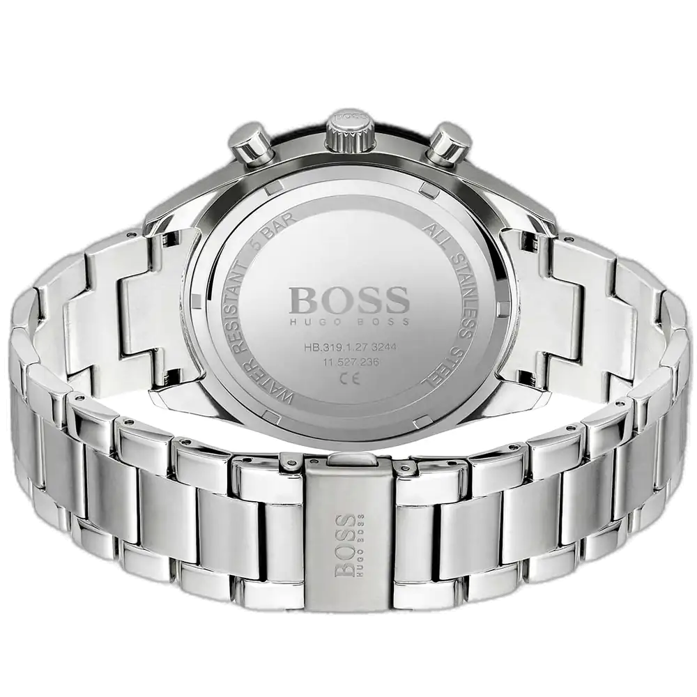 ارفع أناقتك المغامرة مع ساعة هوجو بوس الأصلية للرجال، موديل (سانتياغو) 1513862 كرونوغراف. تتميز هذه الساعة الديناميكية بمينا أسود جريء وسوار ستانلس ستيل مصقول باللون الفضي، لتجمع بين الفخامة العصرية والوظائف الدقيقة.