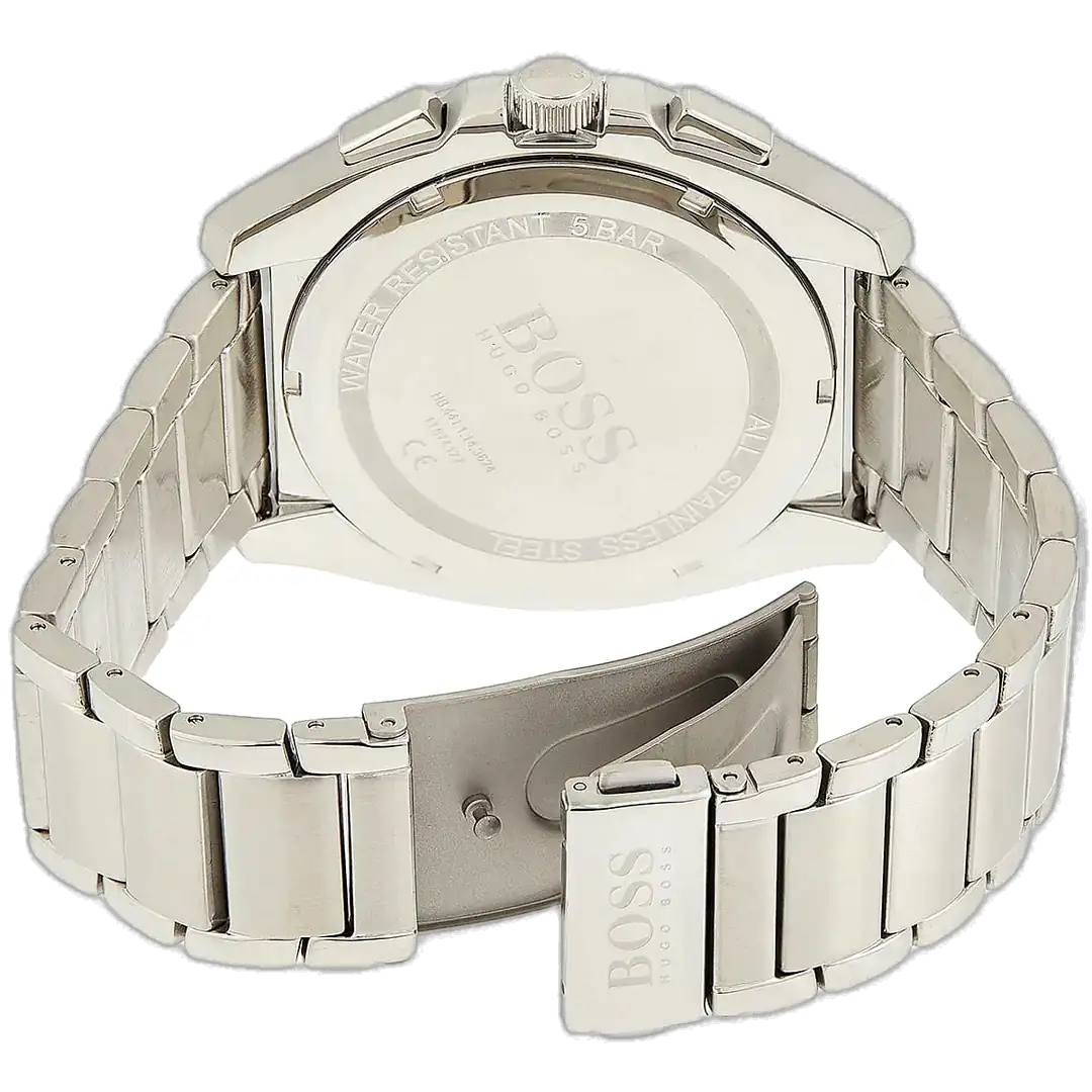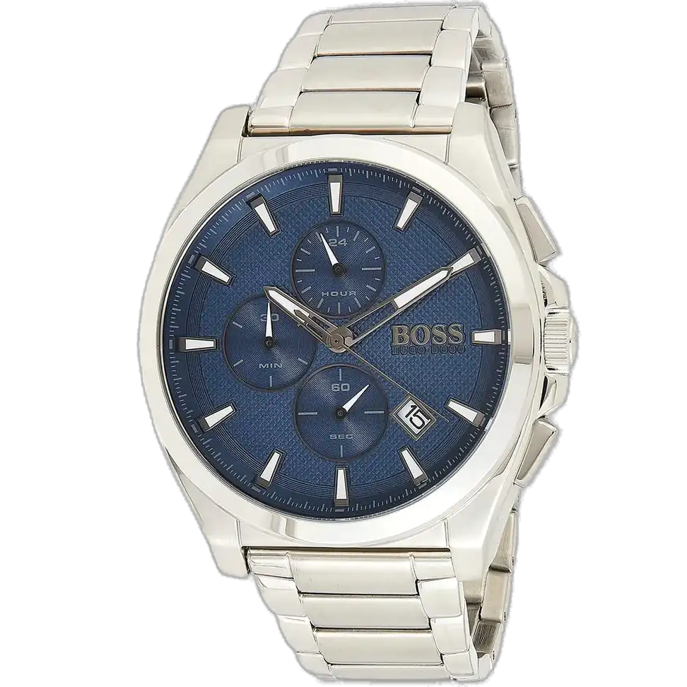 تحكم بأناقتك مع ساعة هوجو بوس الأصلية للرجال، موديل (جراند ماستر) 1513884 كرونوغراف. تتميز هذه الساعة الراقية بمينا أزرق نابض بالحياة وسوار ستانلس ستيل فضي فاخر، لتجمع بين الفخامة الراقية والوظائف الدقيقة.