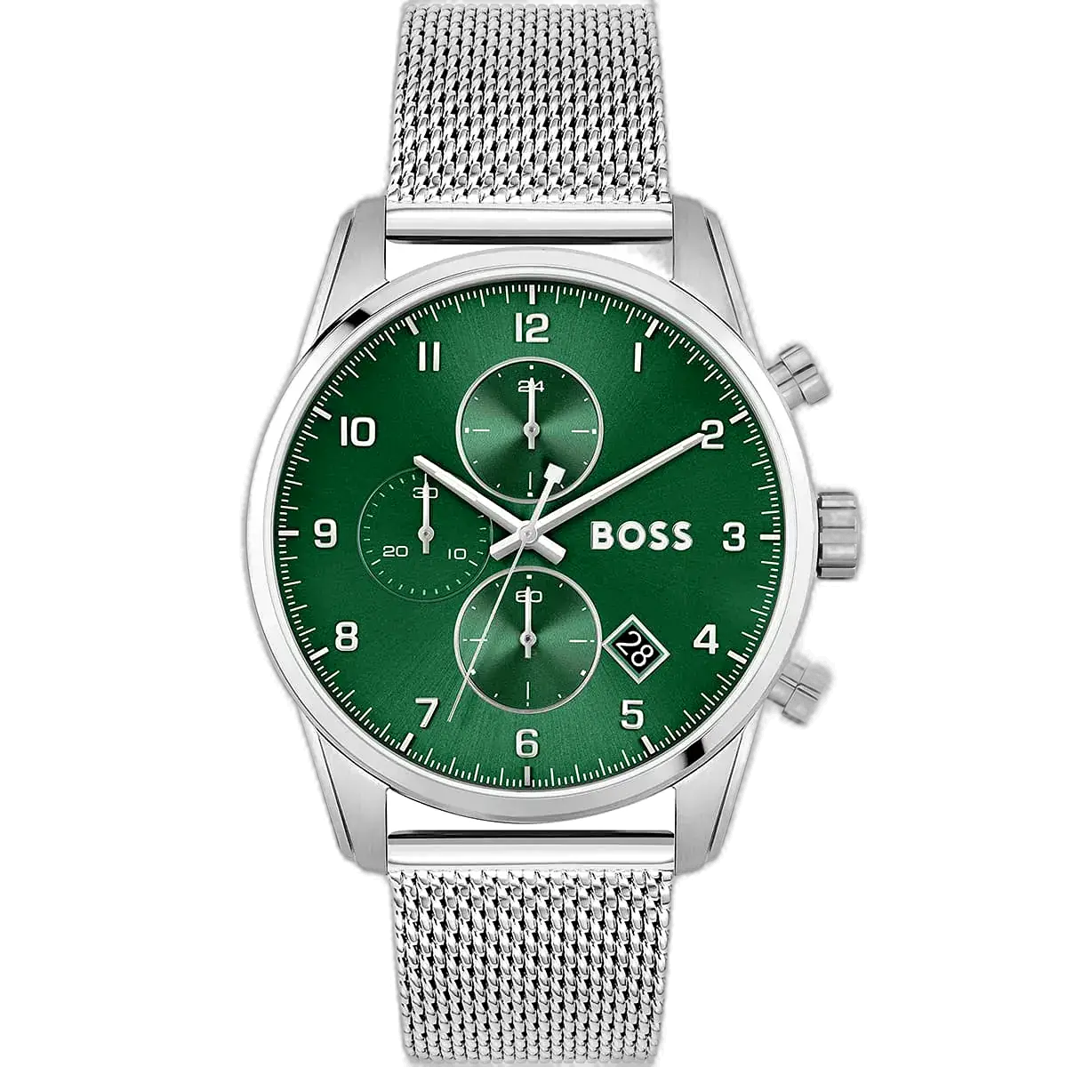 ارتقِ بأناقتك إلى آفاق الطيران مع ساعة هوجو بوس الأصلية للرجال، موديل (سكاي ماستر) 1513938 كرونوغراف. تتميز هذه الساعة البارزة بمينا أخضر نابض بالحياة وسوار ستانلس ستيل فضي مصقول، لتجمع بين الفخامة المستوحاة من الطيران والوظائف الدقيقة.