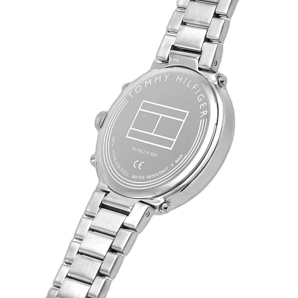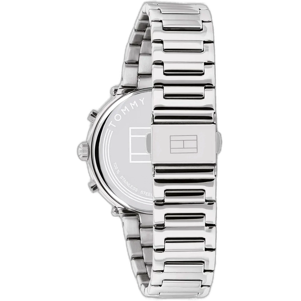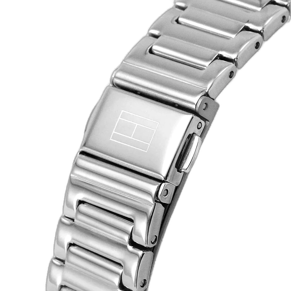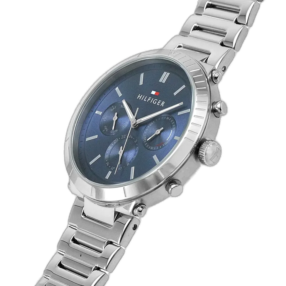 Embrace a sleek, modern, and elegant look with this original Tommy Hilfiger watch. This authentic timepiece, reference 1782349 (Emery model), features a sophisticated blue dial and a polished silver-toned stainless steel bracelet.