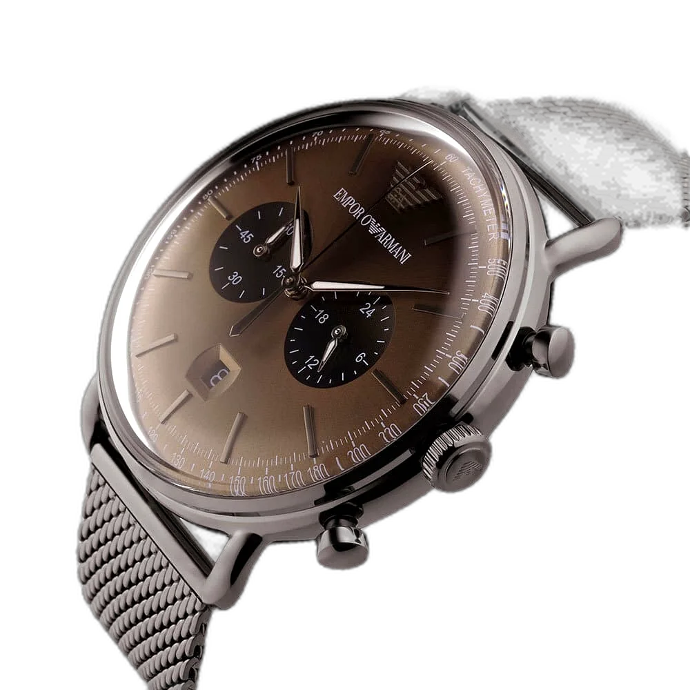 Add a touch of modern elegance to your look with this original Emporio Armani men’s watch, model (Aviator) AR11141. This watch features a classic brown dial and a grey stainless steel strap, giving it a unique look that combines authenticity and modernity.