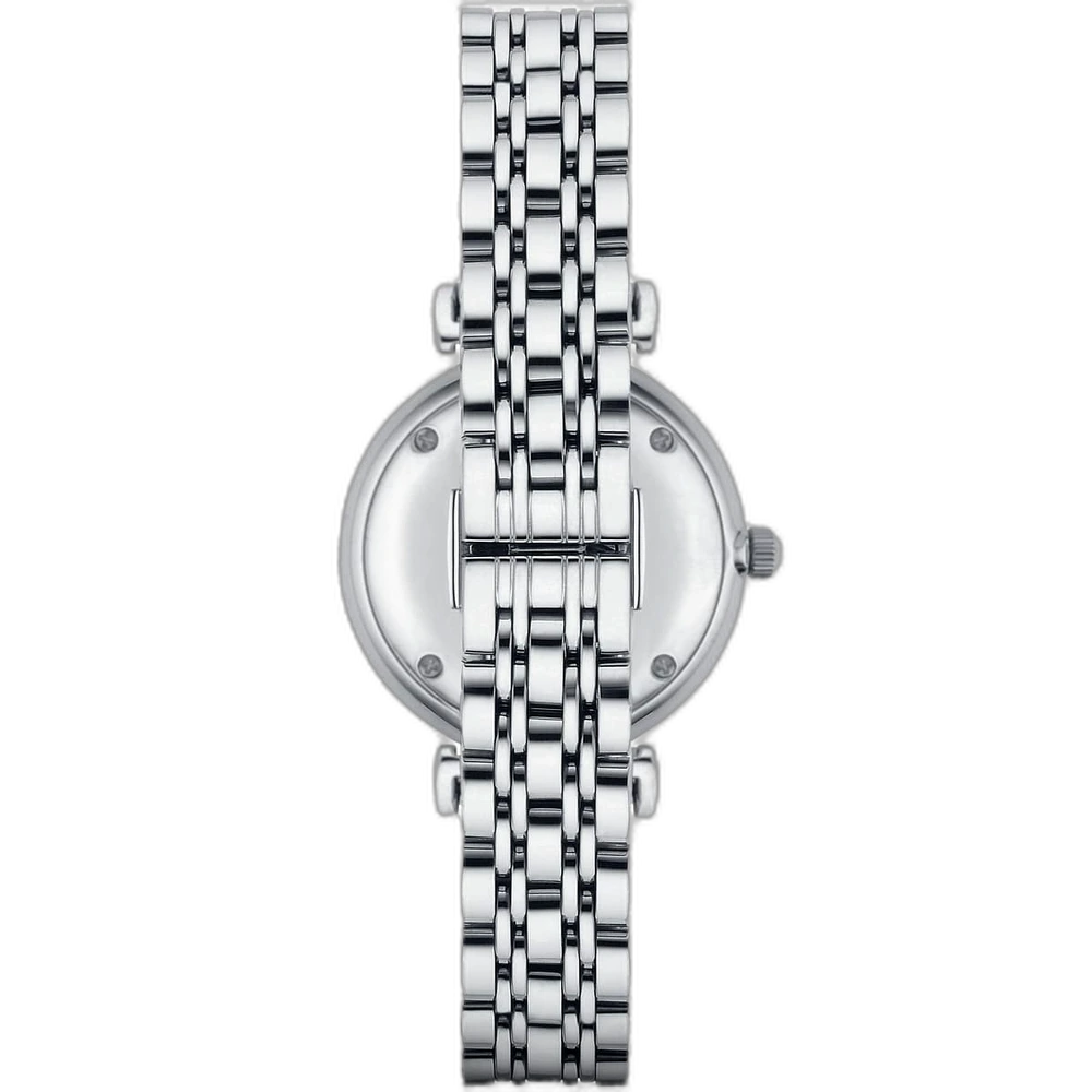 Discover the perfect blend of minimalist design and refined style with the Emporio Armani Gianni T-Bar AR1908 watch. The Emporio Armani brand is a global leader in luxury, celebrated for its commitment to impeccable craftsmanship and a distinctive aesthetic. This watch embodies that legacy with its clean, white mother-of-pearl dial, which provides a fresh and luminous look. The polished silver-toned stainless steel case and strap add a touch of timeless elegance, making this a versatile piece that effortlessly complements both casual and formal attire.