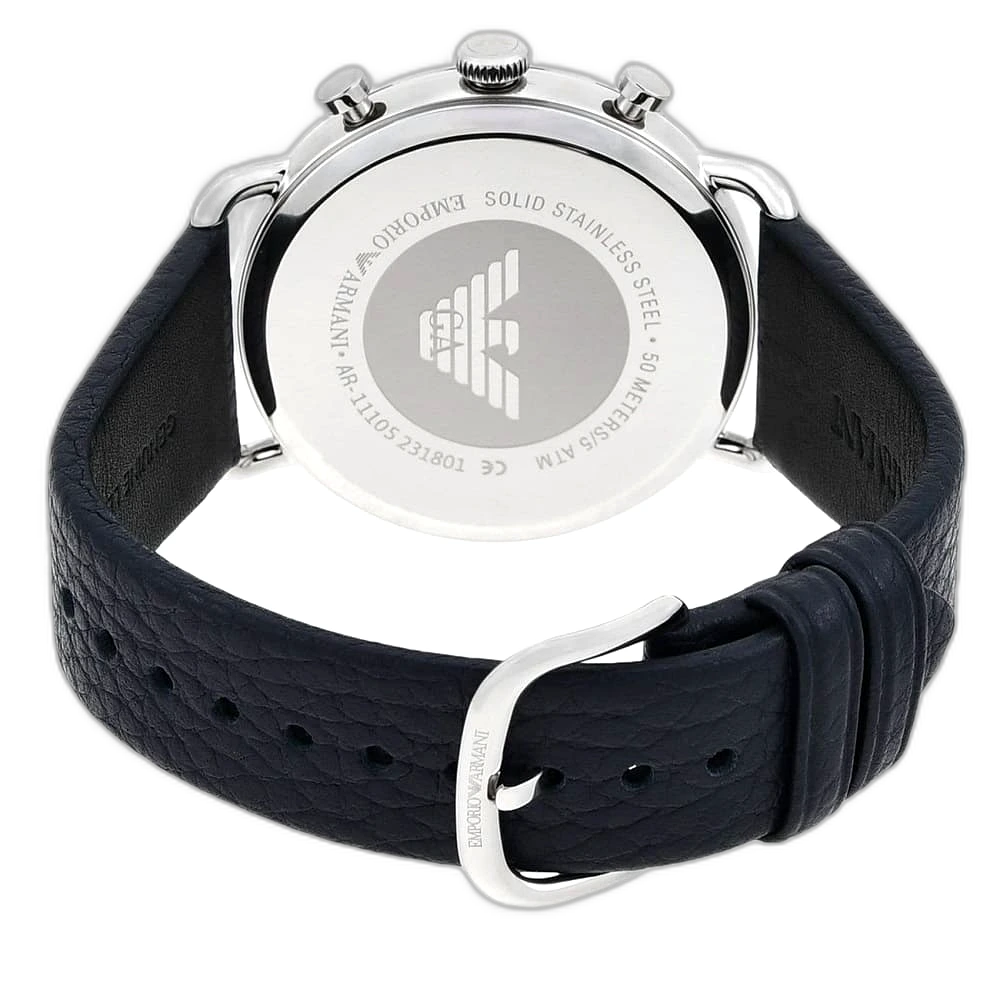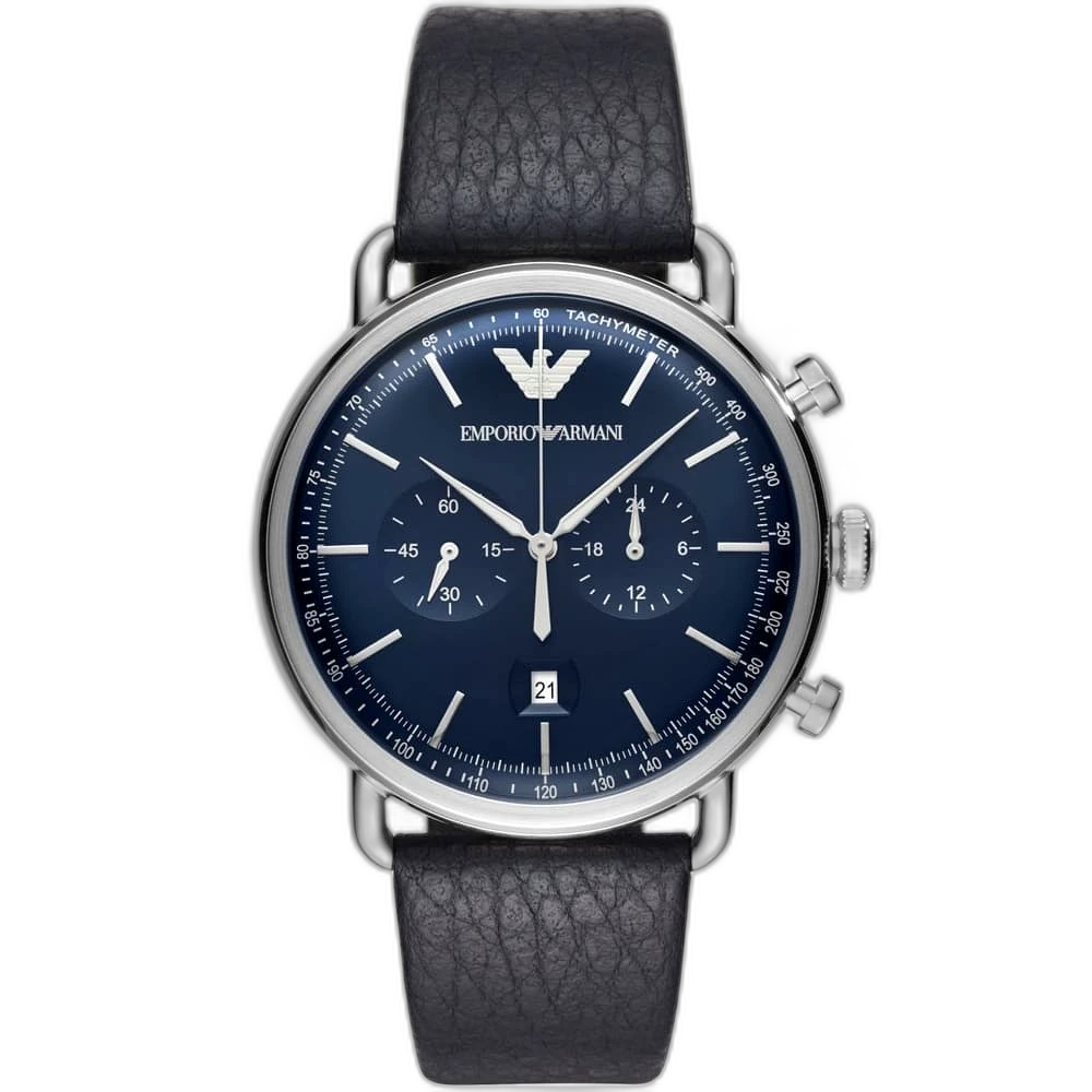 Make a sleek, sophisticated statement with this original Emporio Armani watch. This authentic timepiece, model Aviator AR11105, features a striking blue dial and a classic black genuine leather strap, creating a timeless and refined look.