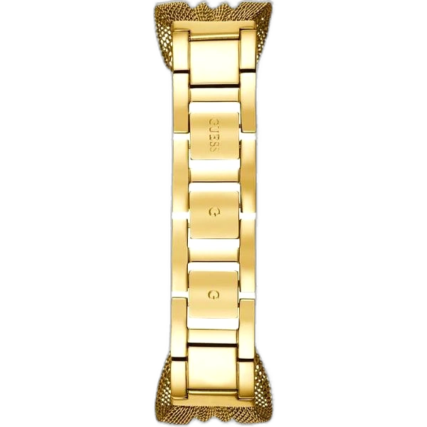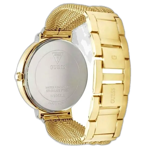 The central element is the stunning gold-tone dial. Unlike simple dials, this gold surface often features a sunray brush finish, meaning it catches the light beautifully and moves subtly as your wrist moves, adding depth to the watch’s pure glamour. The hands and indices are also gold-tone, often accented with white or crystal detailing to ensure legibility despite the monochromatic theme. Powered by a precise Quartz movement, the Guess Chiffon W1083L2 Watch is the perfect blend of high fashion and functional reliability.