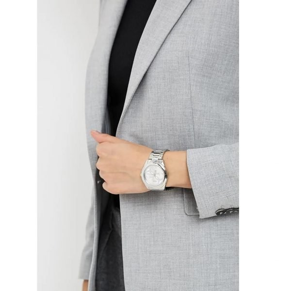 The stainless steel bracelet features a polished silver finish and a secure safety clasp, delivering both style and comfort. Weighing 122 grams, the watch offers a solid feel on the wrist without compromising wearability.