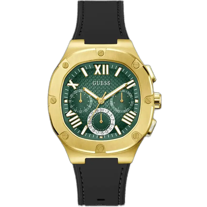 At the heart of this timepiece is a reliable quartz multi-function movement, ensuring the accurate display of all features. The Guess Headline Green Dial offers a refreshing alternative to traditional colors, providing a focal point for your entire outfit. Complementing the bold case and dial is the Men’s Black Silicone Watch strap. This material is chosen for its superior practicality, offering exceptional comfort, flexibility, and high resistance to wear and tear. The black color of the strap anchors the vibrant green and gold, providing the stability needed for everyday use. With 50 meters (5 ATM) of water resistance, this watch is built for both style and daily activity.